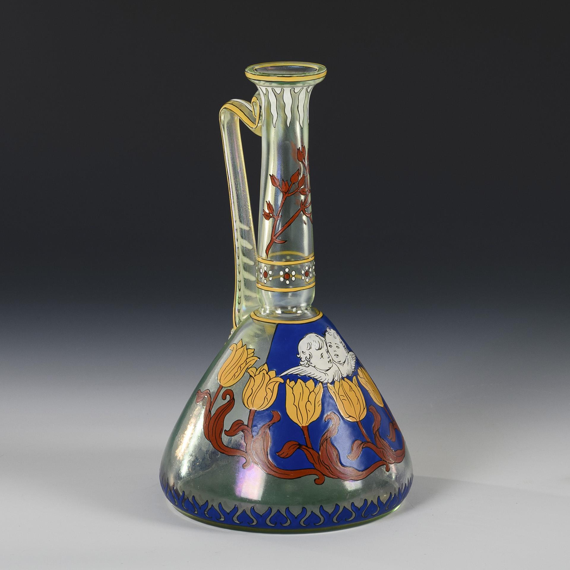Conical body, narrow neck, curved handle. The front depicts a band of tulips with two angel heads on a blue background.