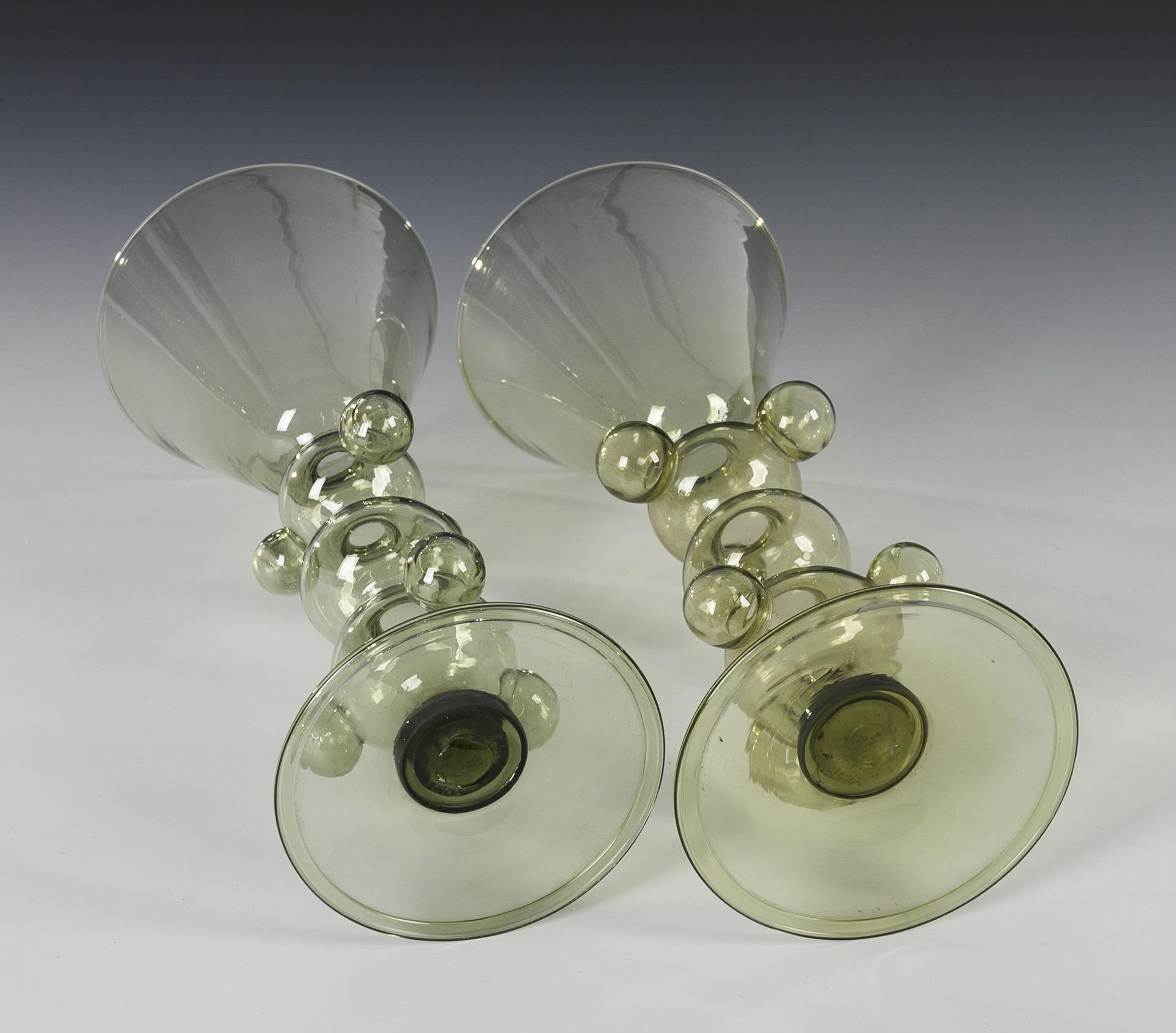 Conical bowl, multi-jointed hollow stem of three spherical nodes, hollow-blown finials, round foot with everted rim; pontil mark.