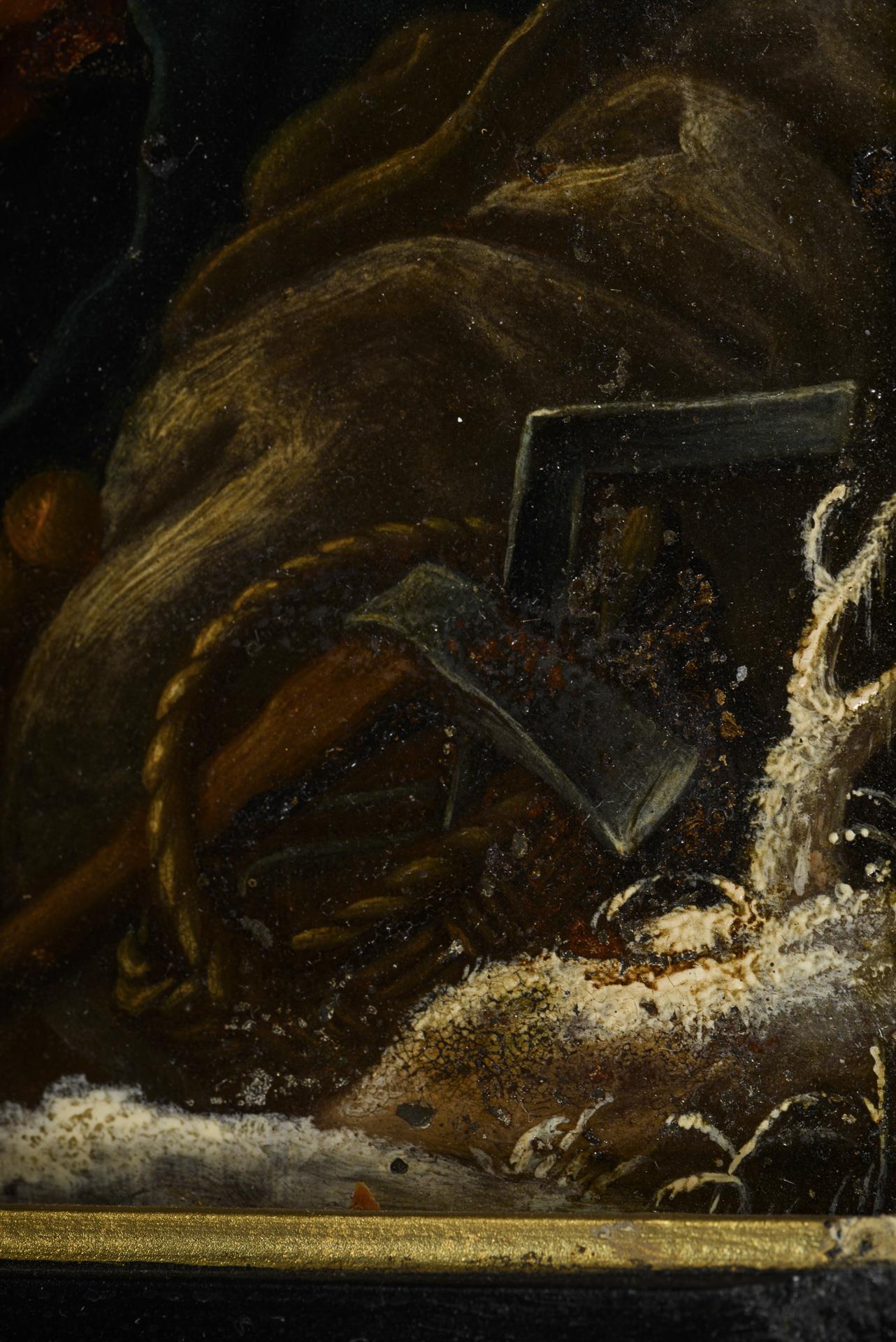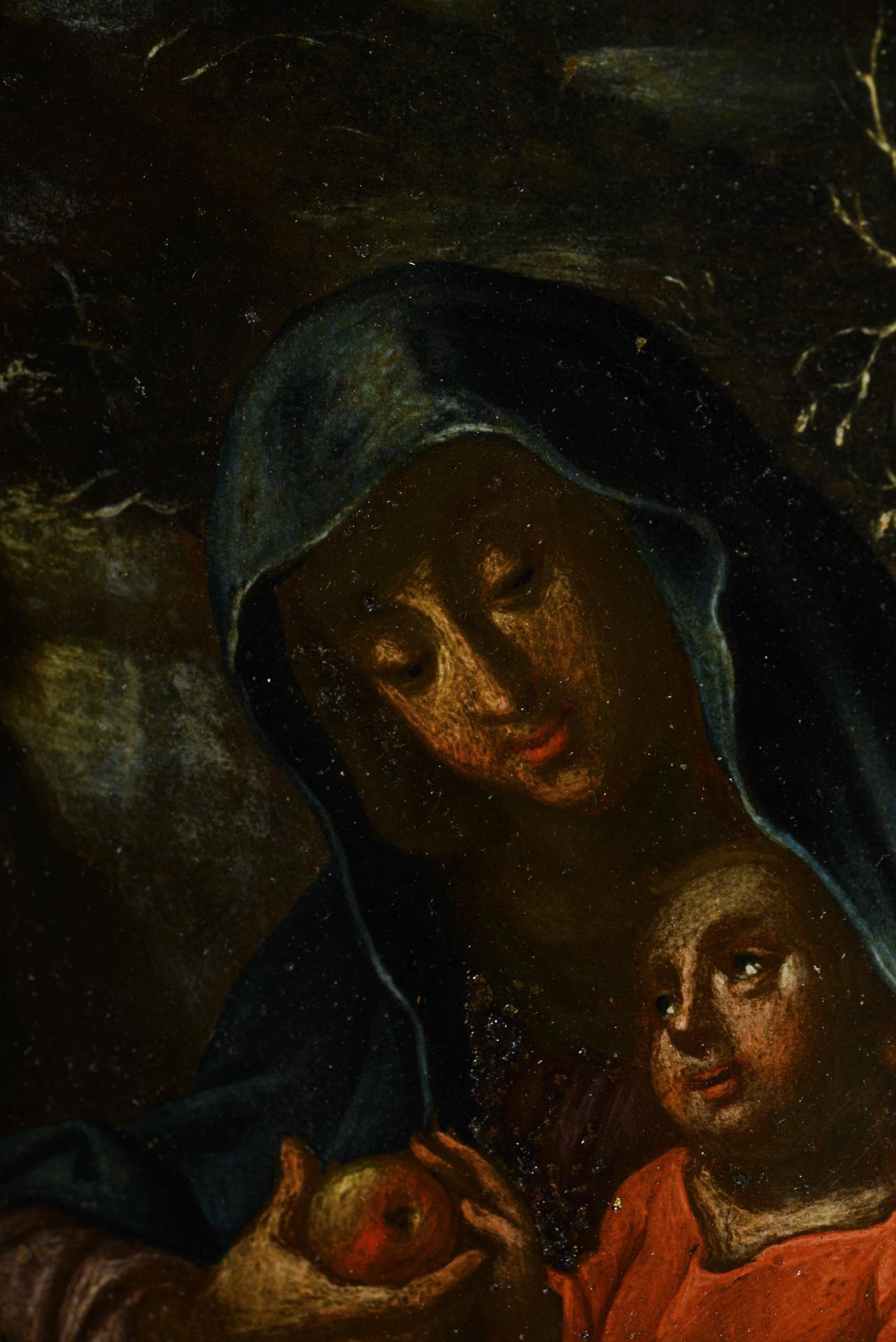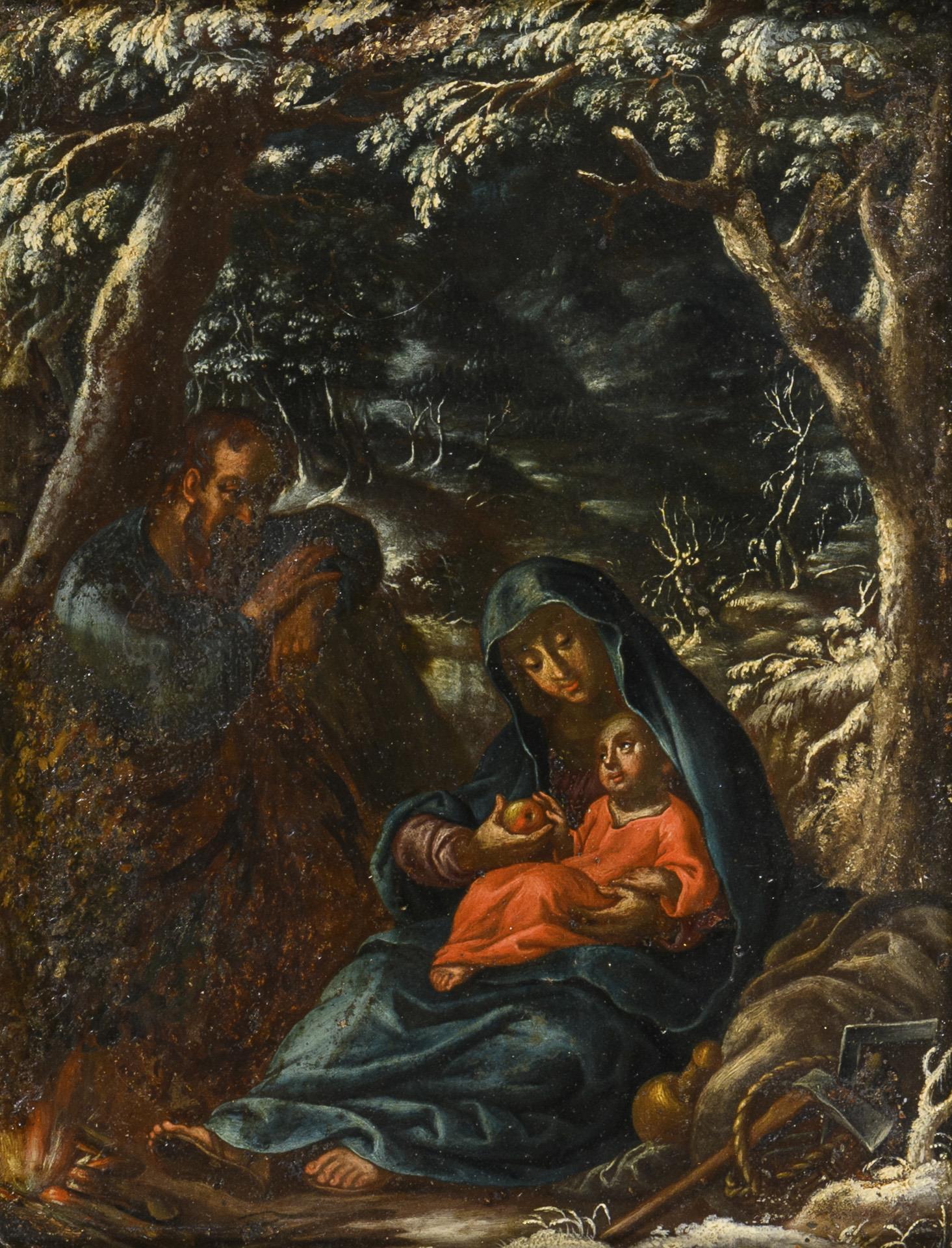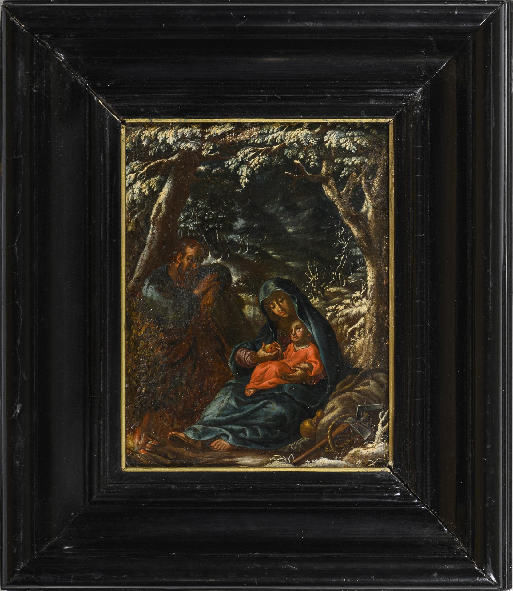 The Holy Family under the protection of the trees in a wintry forest landscape. Traces of age.