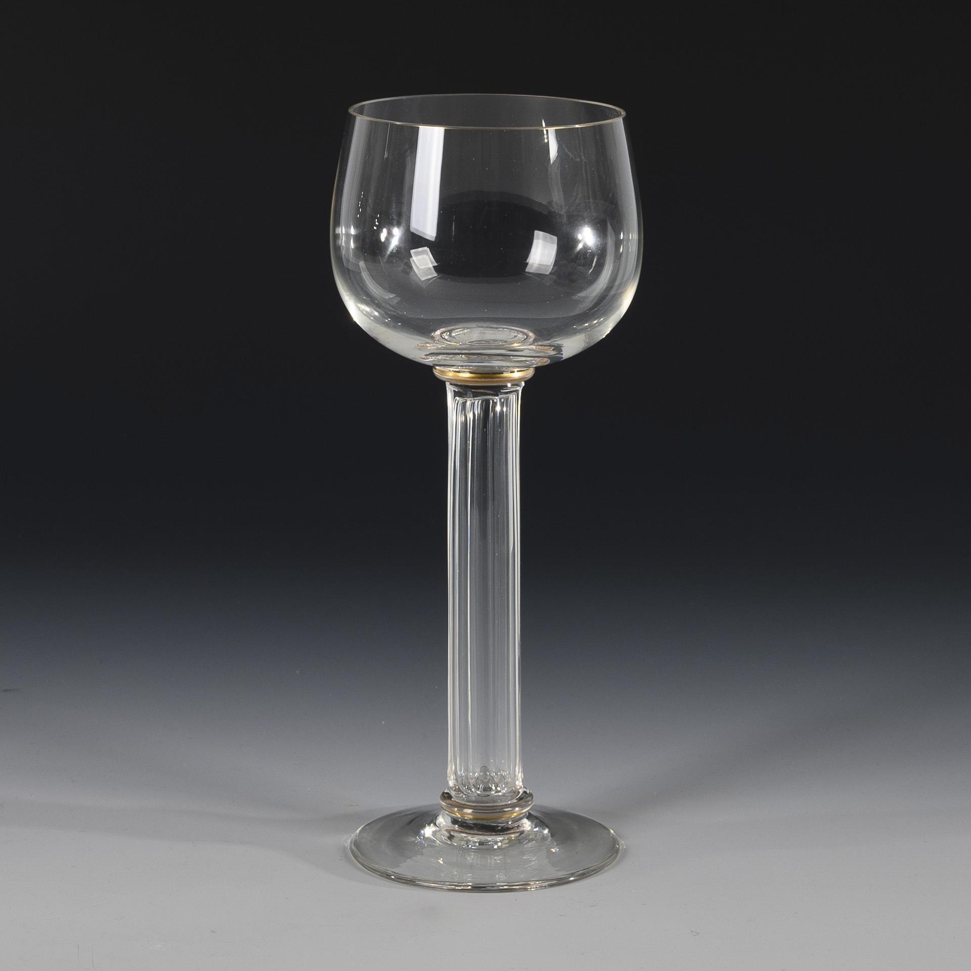 Bulbous bowl, eight-faceted, cylindrical hollow stem, round foot. Minimal gold abrasion, minimal chipping to the inner rim.