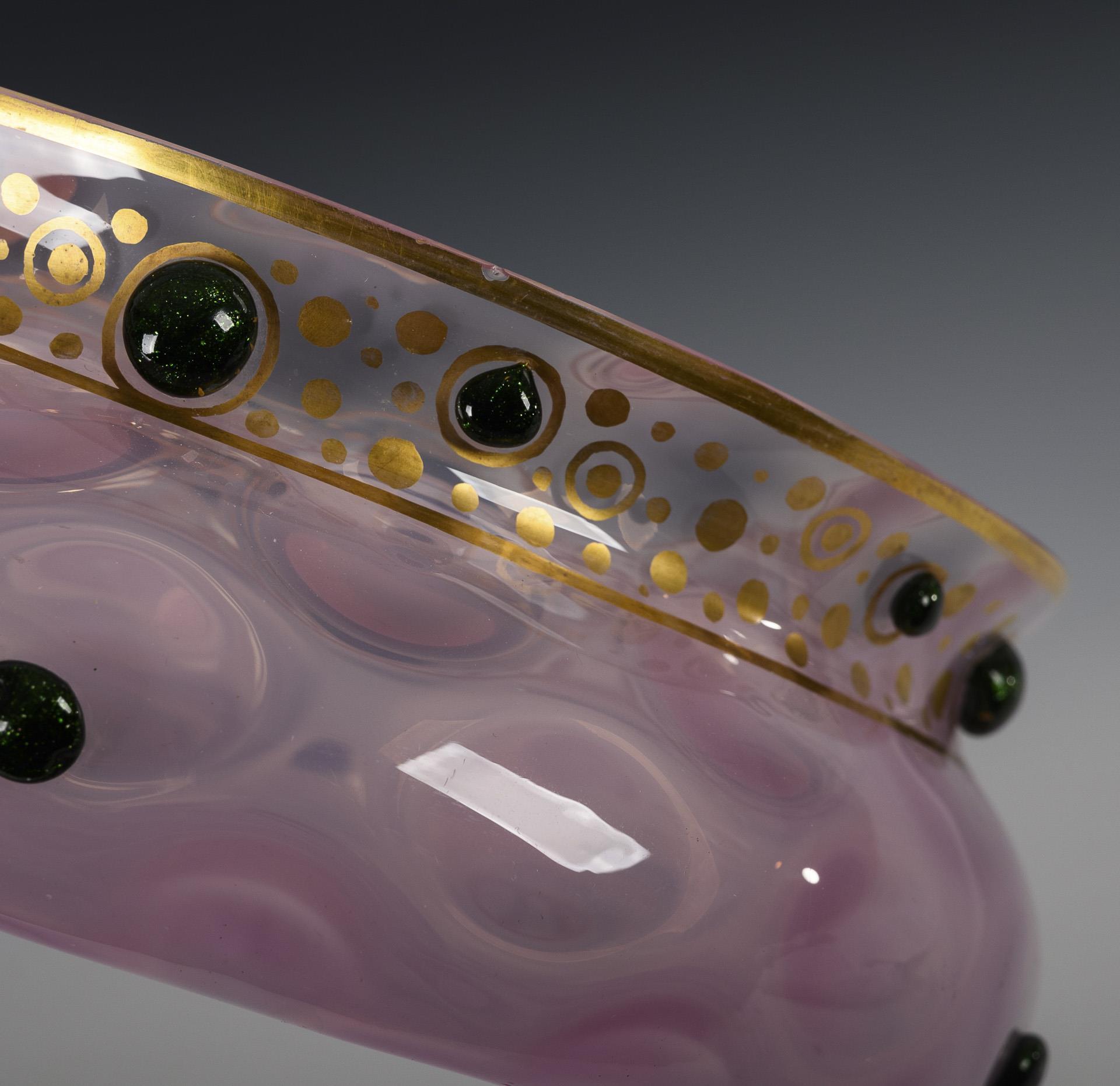 Pink opal glass, green aventurine glass, gold decoration. H 6.5 cm, Ø 18 cm.