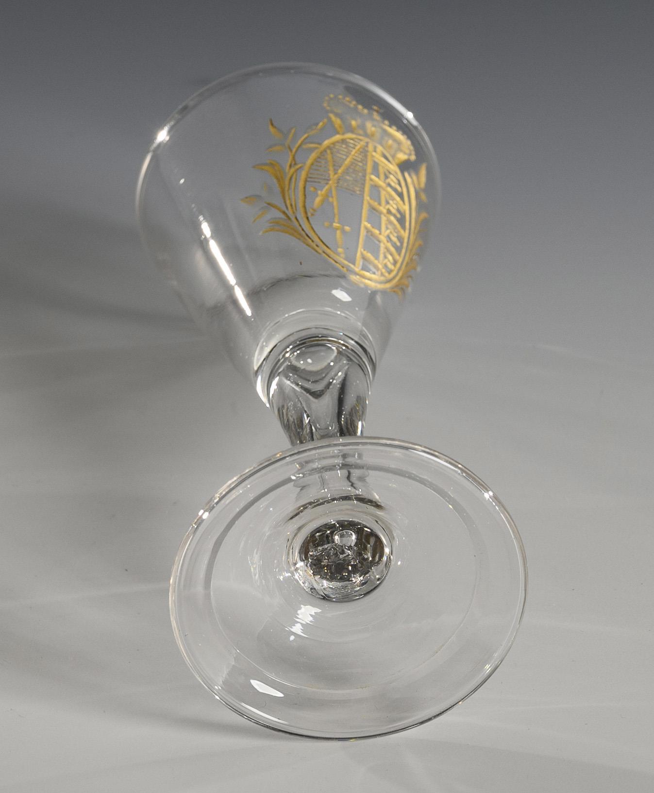 Pointed goblet, hollow shaft, round foot with turned rim; pontil mark. Engraved and gilded Saxon coat of arms on the front. Partial gold abrasion.