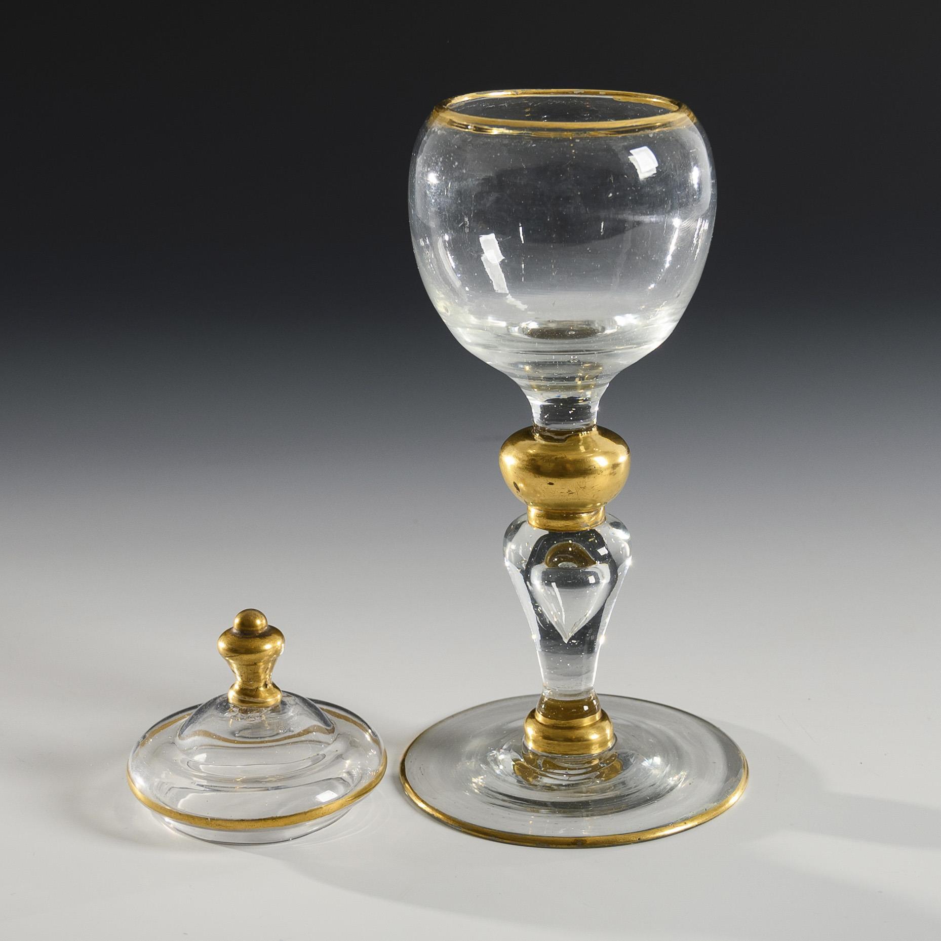 Bellied bowl, knobbed lid, baluster stem with nodus and pierced air bubble, round foot; pontil mark. Minimal gold abrasion.