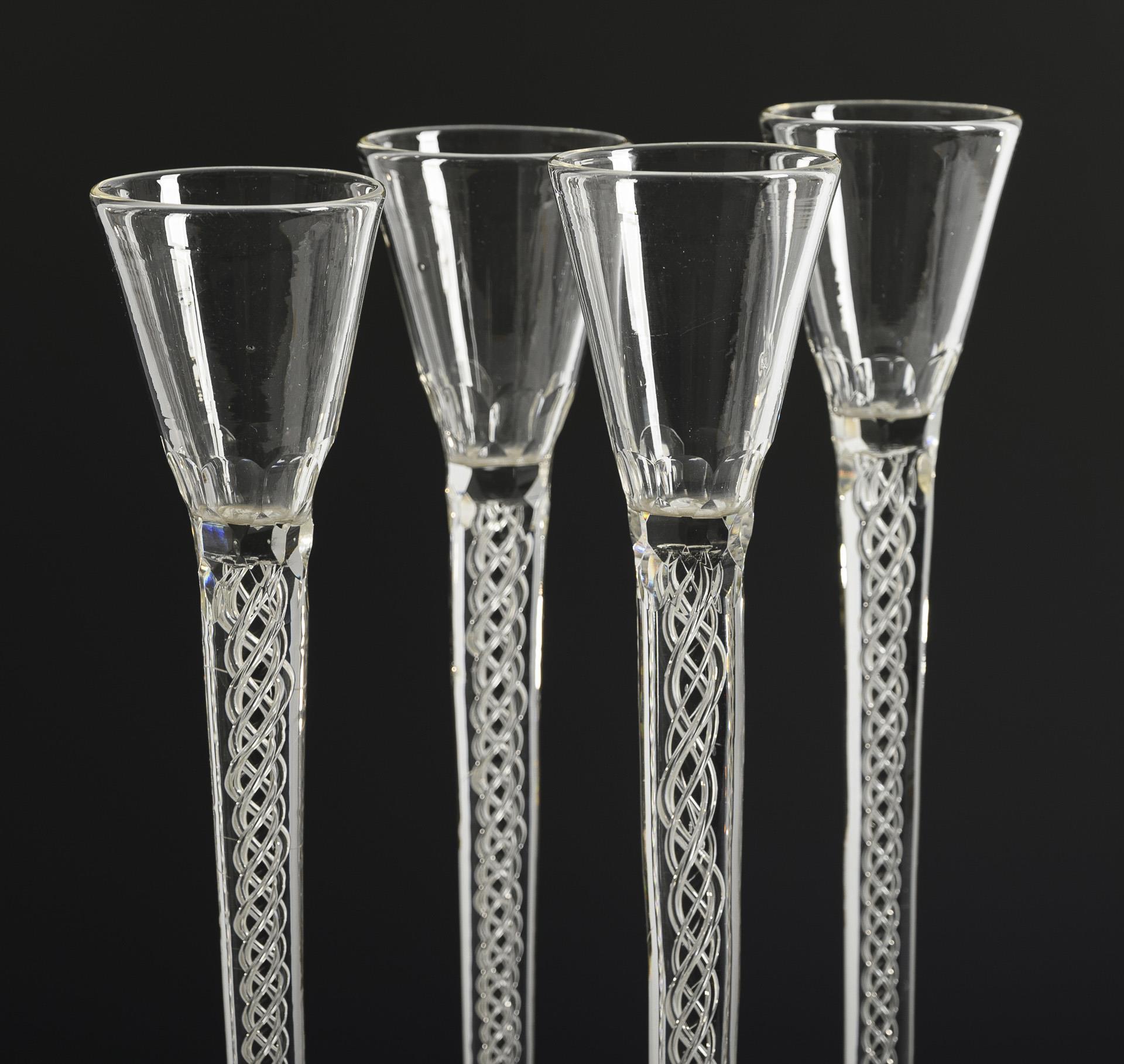 4 large liqueur glasses with spiral stems. Josephinenhütte.