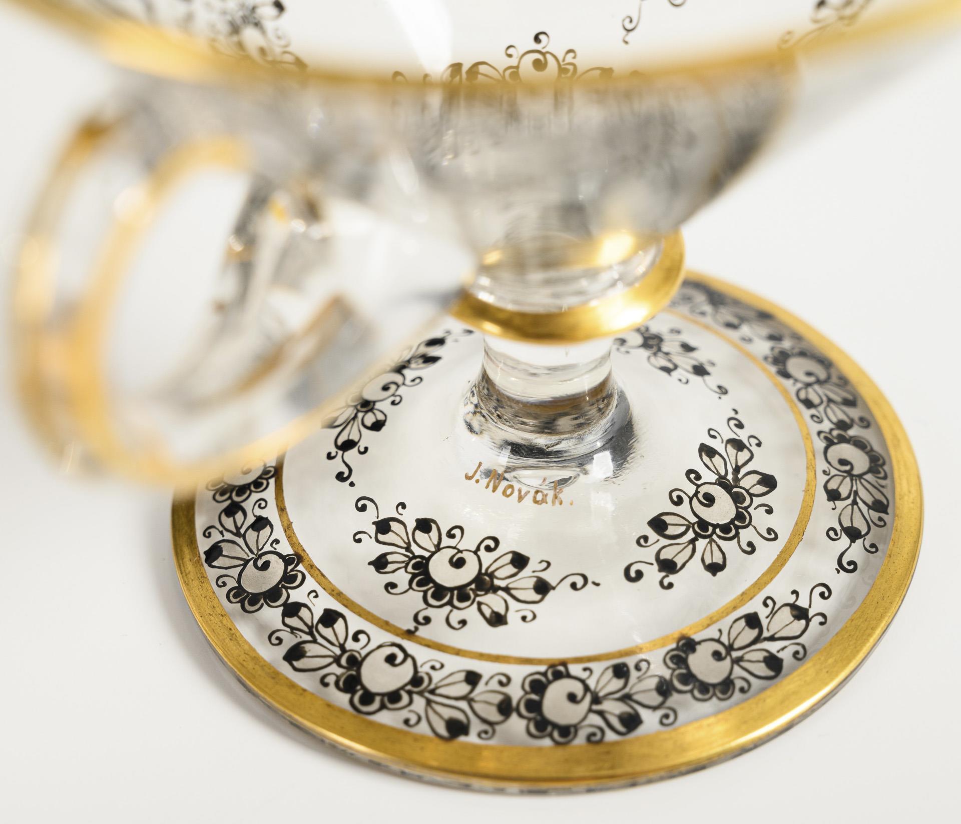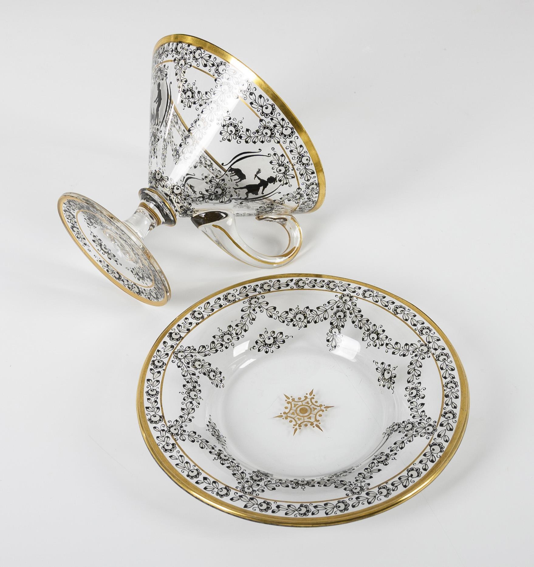 Conical bowl, eared handle, short cylindrical stem, round foot and saucer. With black solder-painted children and animals in silhouette and flower festoons, partly matt etched. 2 minimal knocks to the rim of the cup.