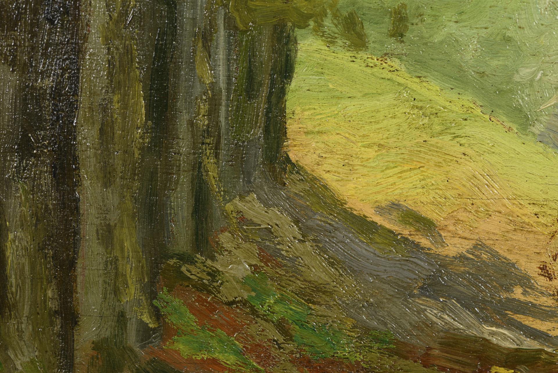Forest path in mountainous terrain with bright sunshine between the dense treetops. Minimal traces of age.