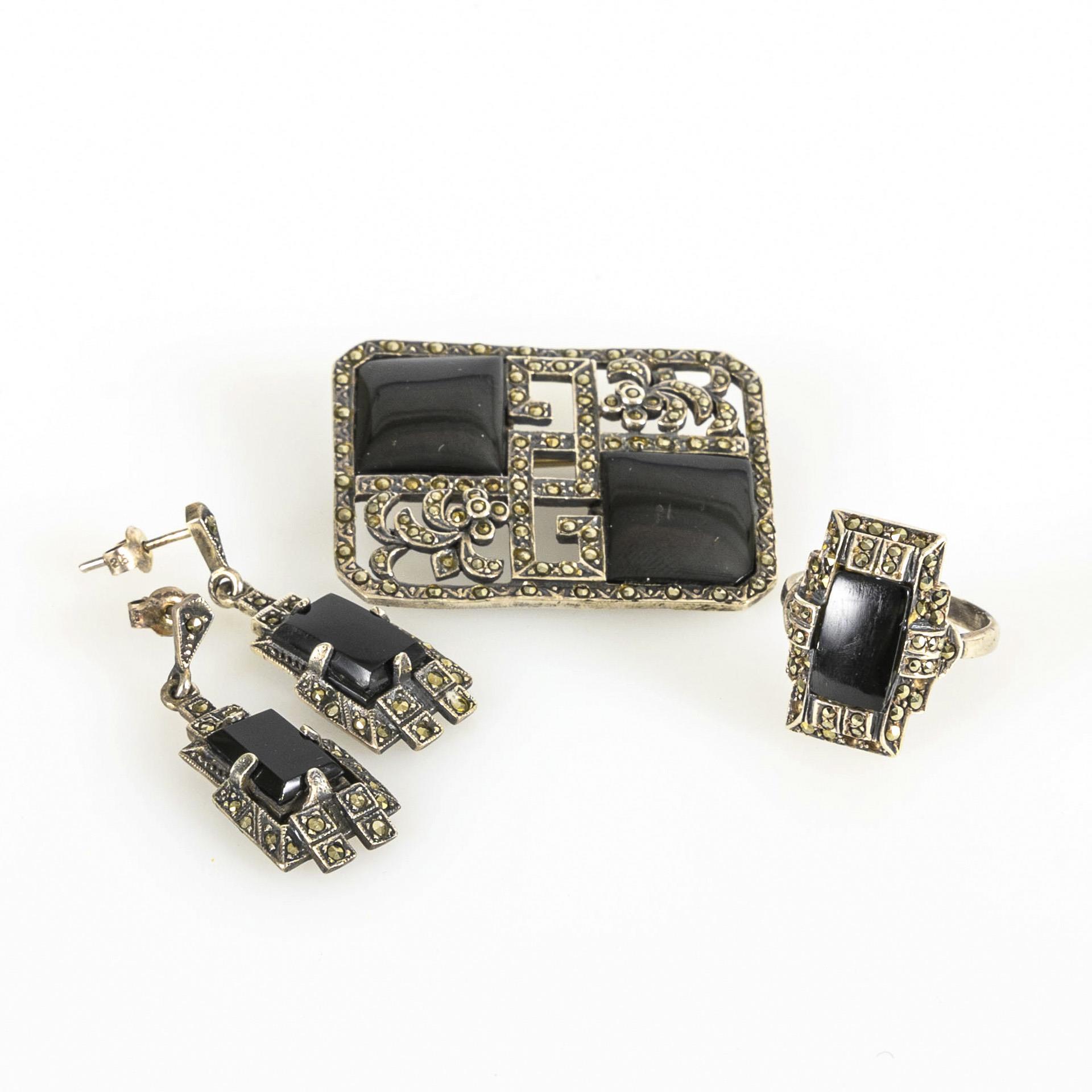 A small group of matching pieces of jewelry with onyx and marcasite trimming in silver. Seven marcasites missing from the ring, two small scratches in the larger onyx inlay of the brooch.