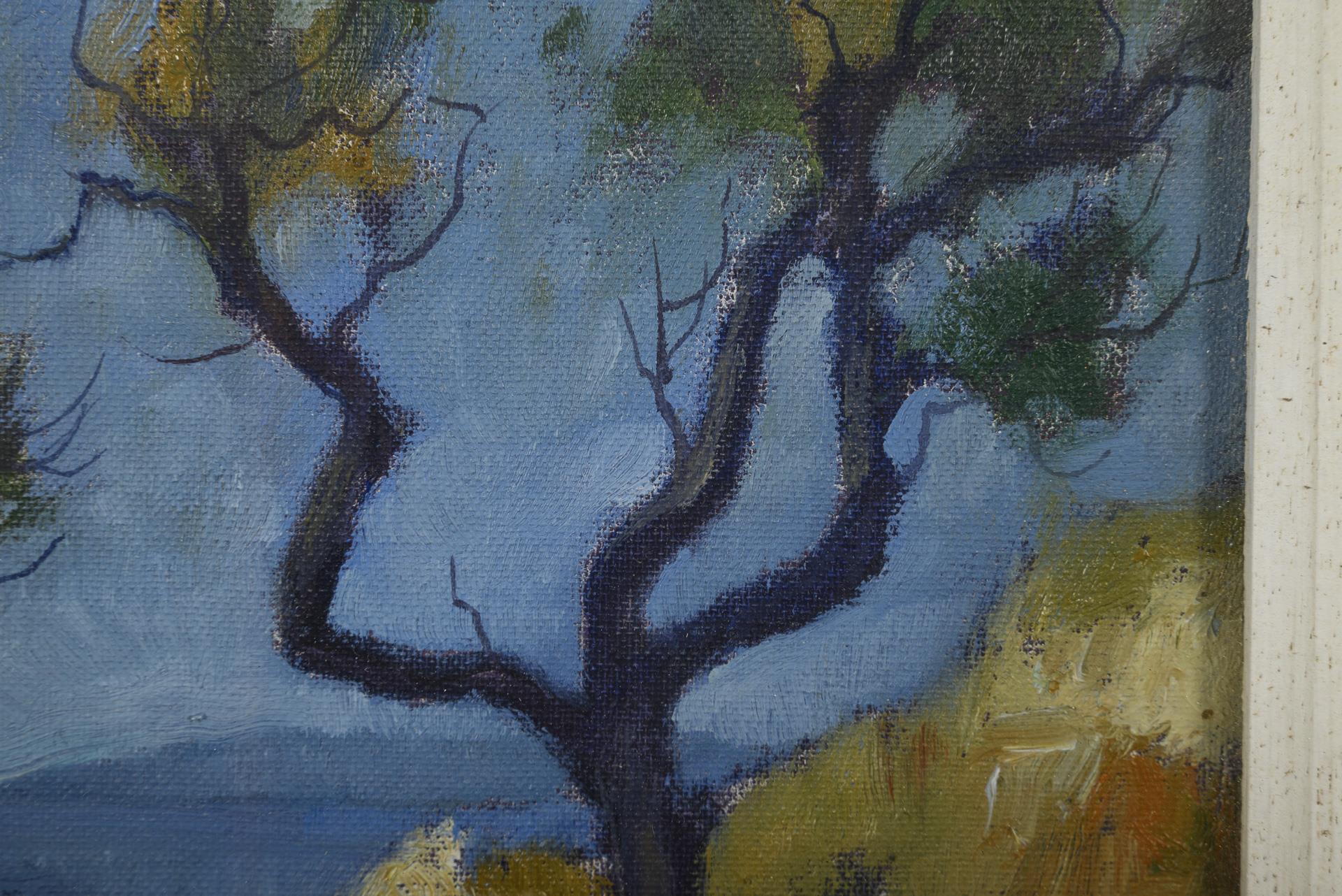 Mountain slope with slender trees in front of houses above the sea in the sunshine.