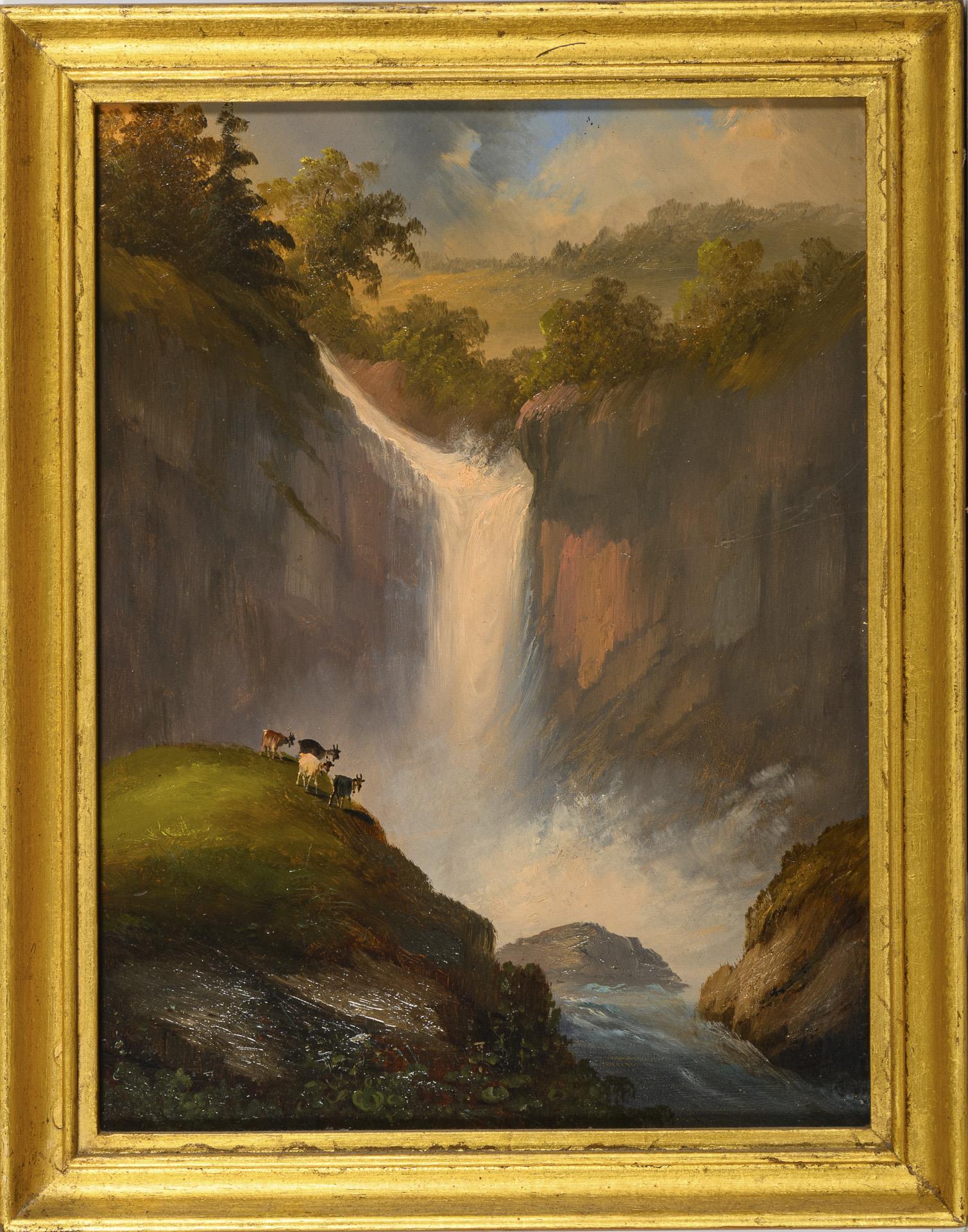 Sunny mountain landscape with animals on a meadow above the river in front of the waterfall.