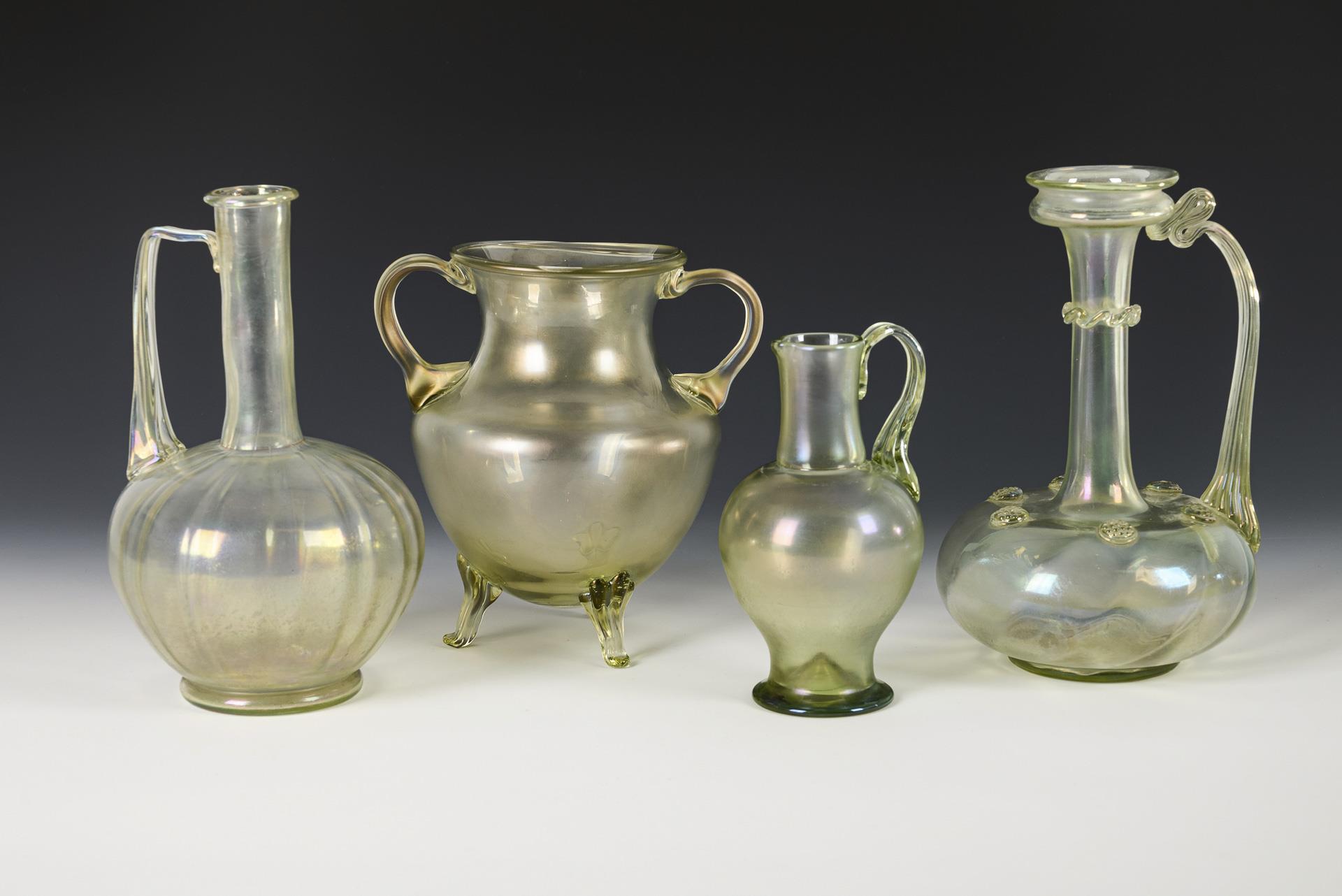1x Cyprus glass: semi-ovoid body with three feet and two handles, crater neck (cf. Zelasko (2011), p. 60/no. 9040) (h 19.5 cm). / 1x: bulbous, lengthwise optically molded blown body with retracted stand, narrow neck and triple grooved, angled handle (H 23.5 cm). / 1x bulging, oblique optically mold-blown body with six applied bosses, narrow neck and grooved, twice folded handle; remains of painting on the neck in brown (H 23.5 cm). / 1x baluster body with round foot, narrow neck and triple-grooved handle (h 17.5 cm) . Nuppenkrug with stress crack at the top of the handle (not visible).