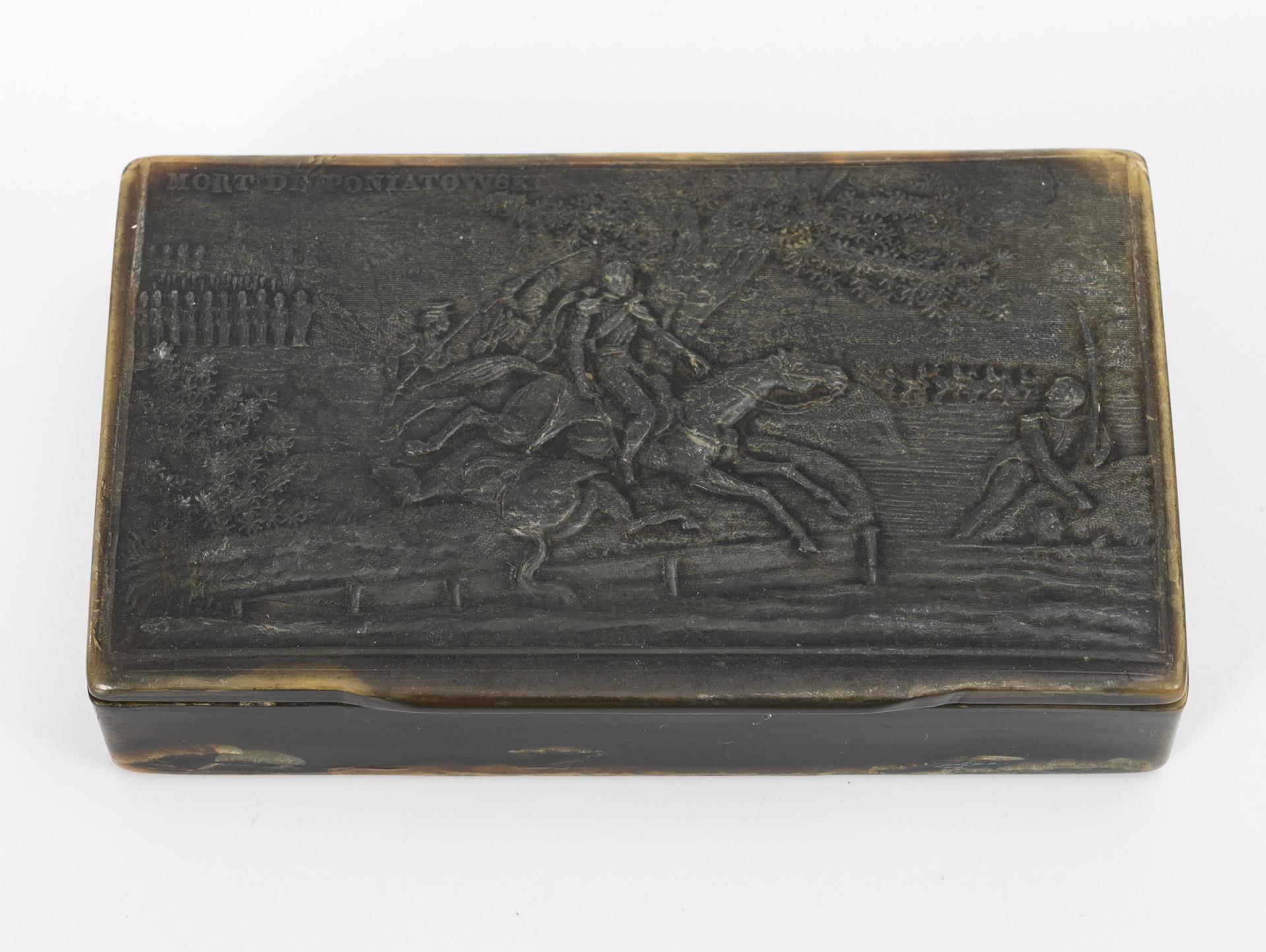 Flat rectangular box, on the hinged lid a battle scene with French inscription: "Mort de Poniatowski". Minor signs of age/use, mostly on the base.