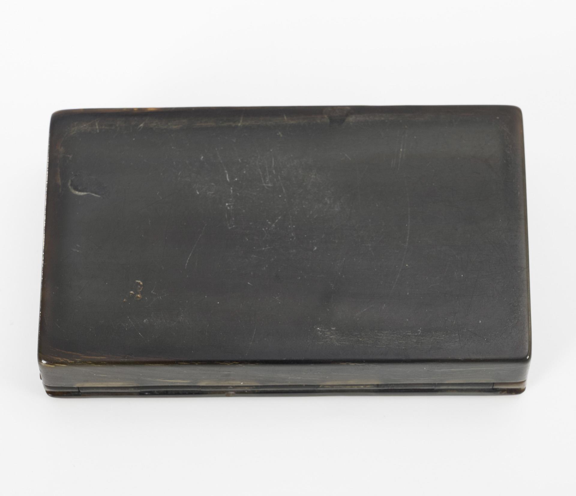 Dark horn, pressed relief on the lid. 2 x 9 x 5.5 cm.