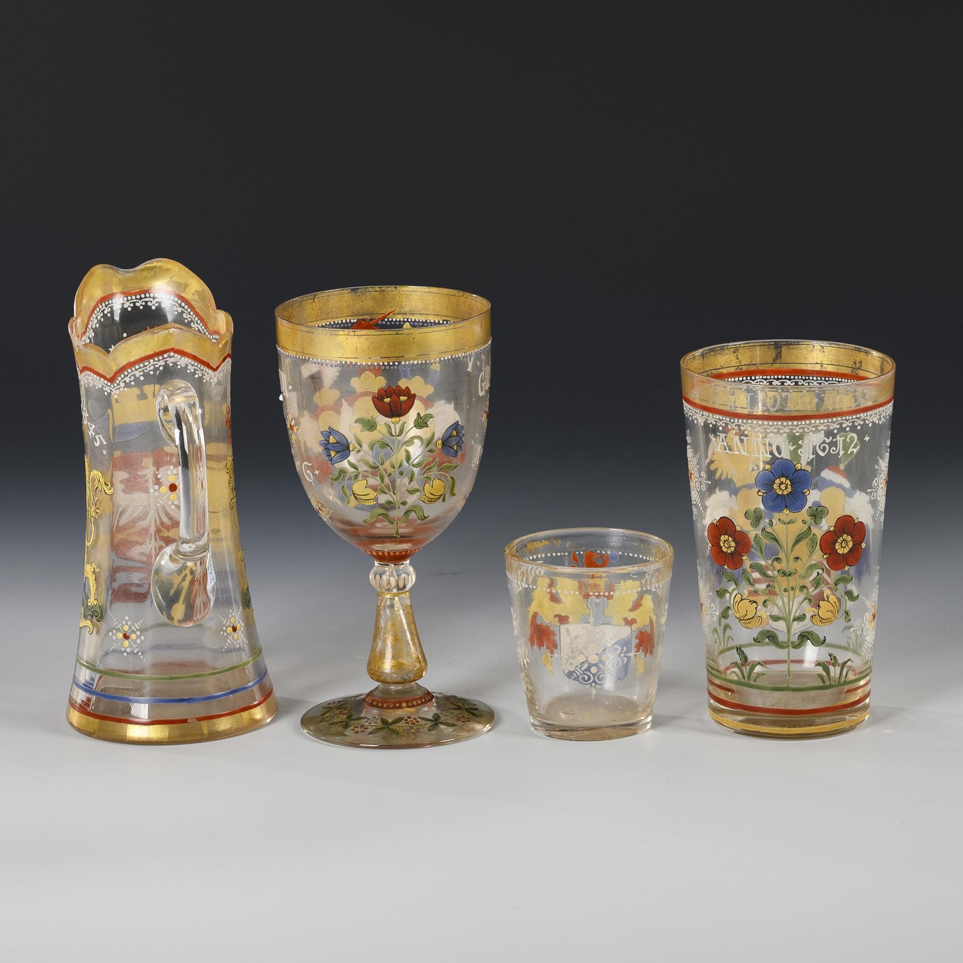 Jug (h 17.5 cm), goblet (h 16.5 cm) and two conical beakers (h 7 and 14 cm). All with the depiction of inscribed coats of arms and floral painting. Gold rubbed.