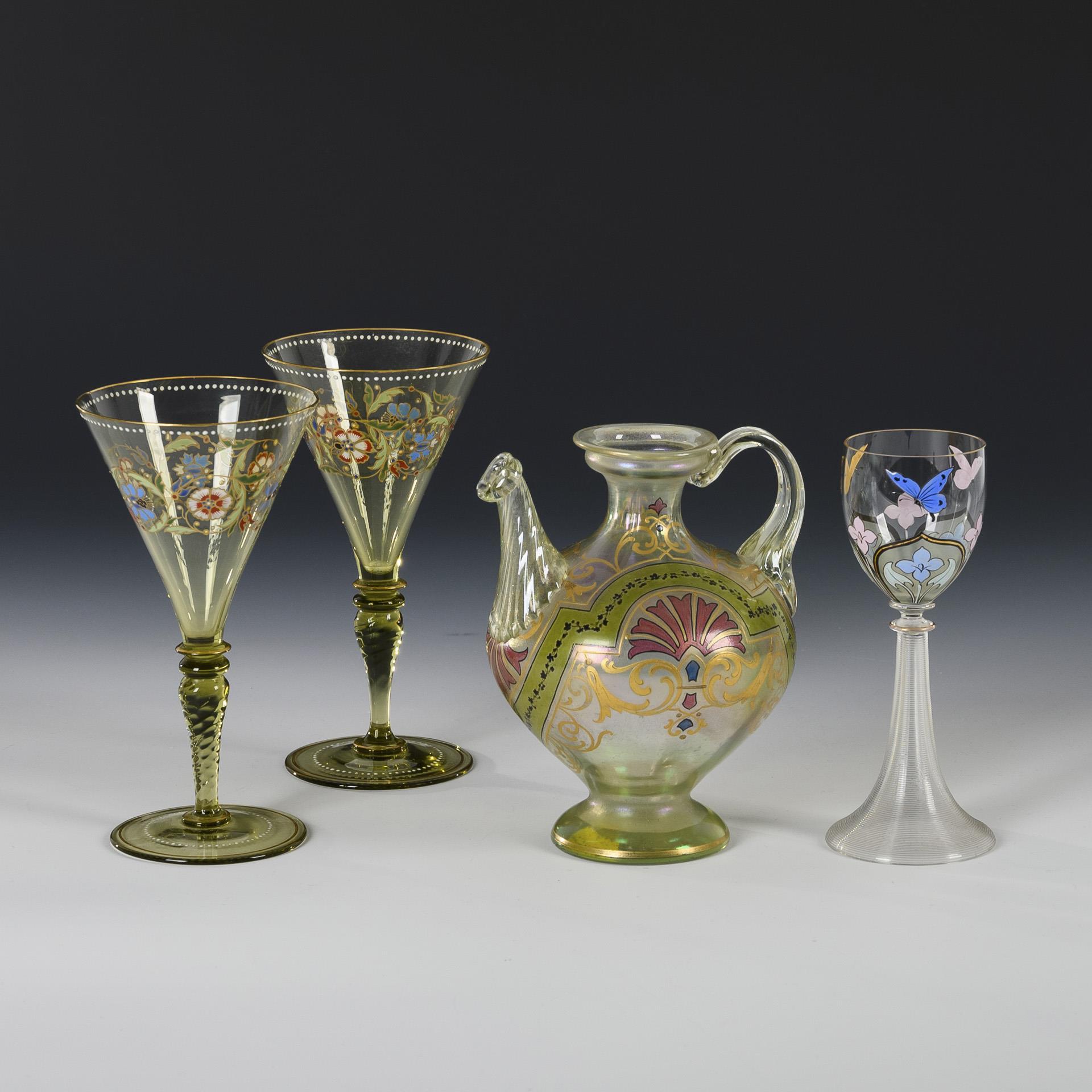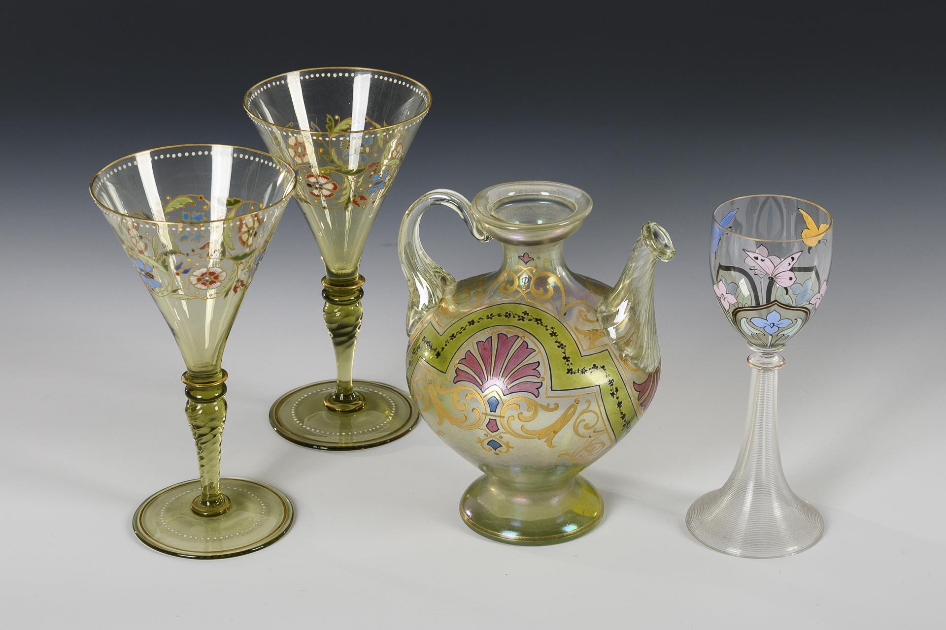 1x jug made of light green, iridescent uranium glass: bulbous, elongated body, grooved handle and grooved snout, crater neck, round foot; polychrome ornamental transparent enamel painting and gold painting (h 15.5 cm). 2x THERESIENTHAL: Pointed goblets of green glass with polychrome, floral enamel painting, slanted optical baluster stem, round foot (H 16.5 cm). / 1x liqueur glass made of colorless glass with floral and butterfly painting on the ovoid dome, grooved trumpet foot (H 15 cm).