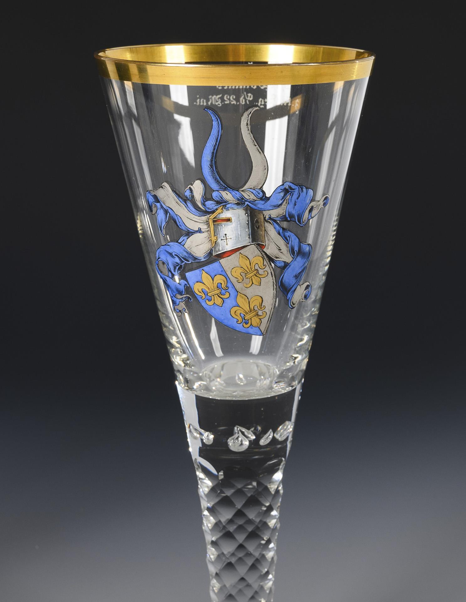 2 pointed goblets made of colorless glass with cobalt blue inner rim, pierced air bubbles, solid, conical stem and round base. / 1 pointed goblet of colorless glass with an enamel-painted coat of arms on the front, pierced air bubbles, honeycomb-faceted stem, round foot, signed on the underside "Gebr. Goedecke Hannover".