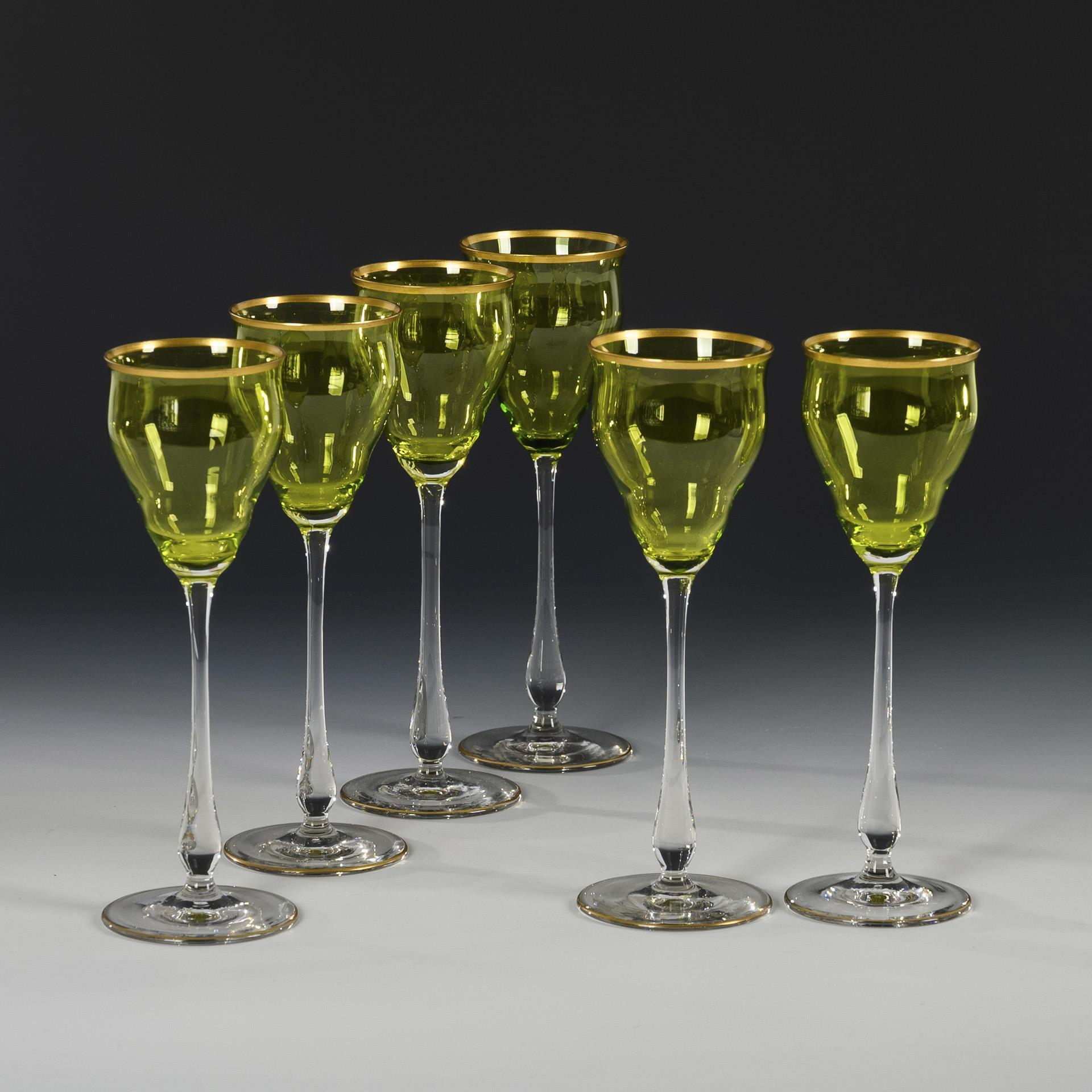 Shape "1465". Bell-shaped cuppa made of pistachio green glass (= "Pistache"), stem and round base made of colorless glass; gold rim. 1x with edge wear, minimal gold abrasion.