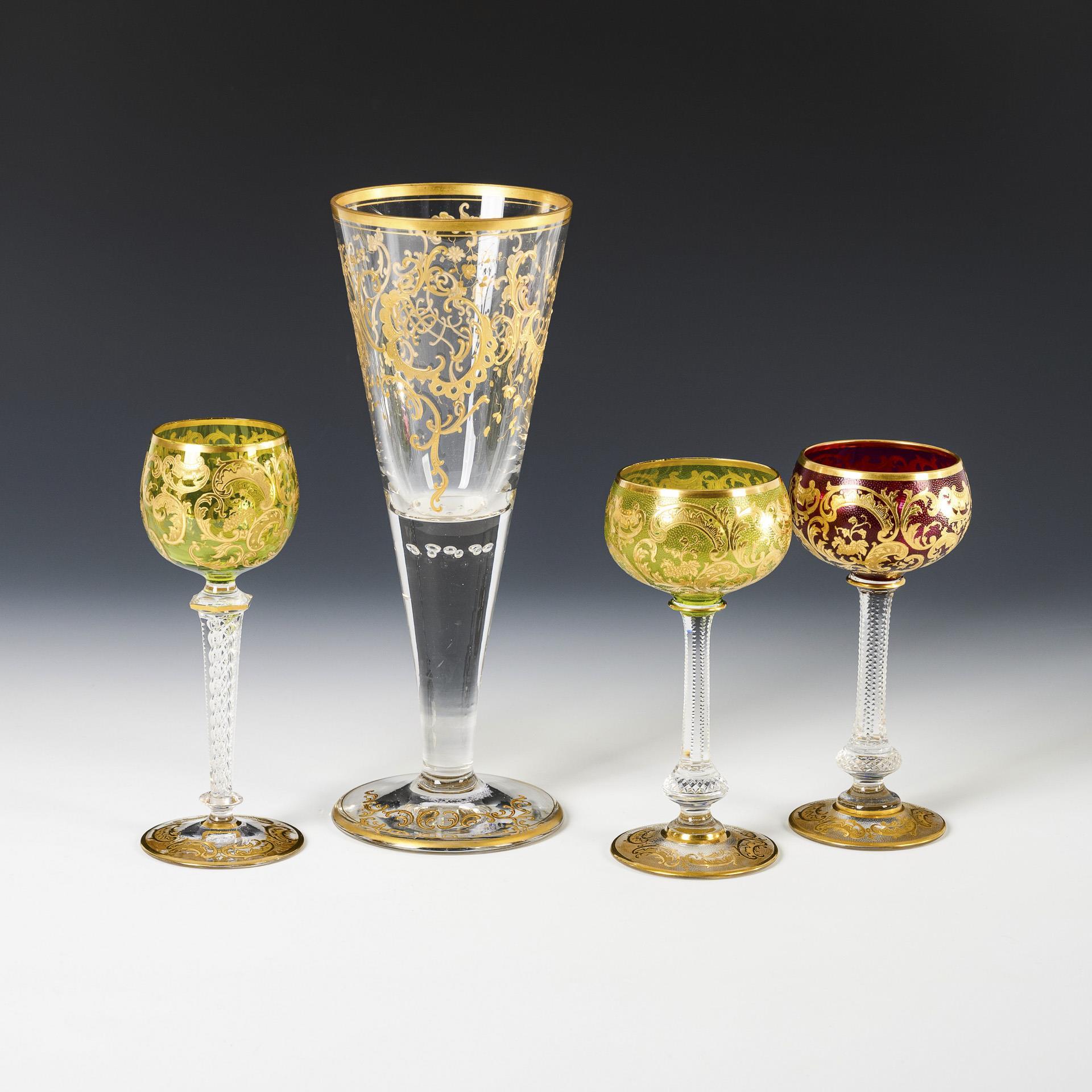 1x probably JOSEPHINENHÜTTE: Pointed goblet of colorless glass with bubble wreath in the dome base, solid stem and round foot, relief gold-painted rocaille decoration (H 28 cm). / 3+1 goblets of colorless glass, bulbous bowl with purple or light green inner rim and etched and gilded rocaille decoration, faceted stem with beveled edges and nodus at the base, disc foot with decoration matching the bowl (h 1x 18.5 and 2x 17 cm).