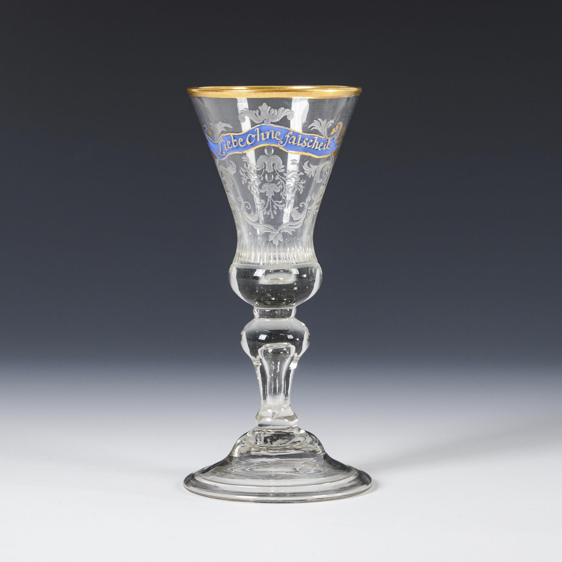 Conical dome with pierced air bubble in the spherical, solid dome base, baluster stem with pierced air bubble, flat hat foot with turned-down rim; pontil mark. The wall with a floral engraving on the front with two small olive lenses and a blue enamel band with the inscription "Liebe ohne falscheit".