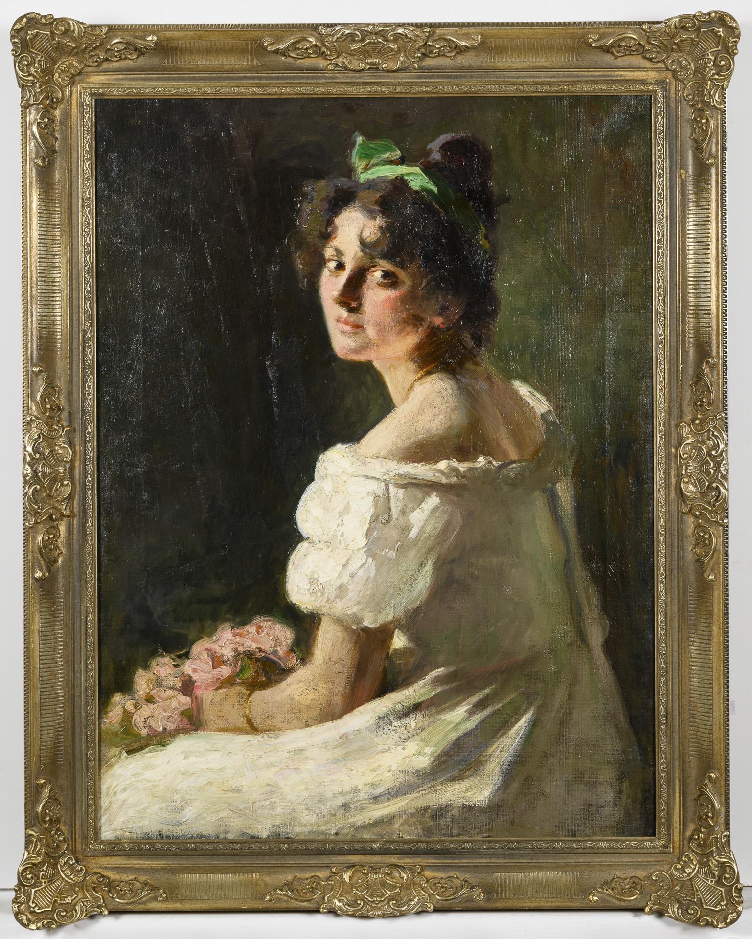Portrait of a young woman in a white dress with a bouquet of flowers and an alert gaze.