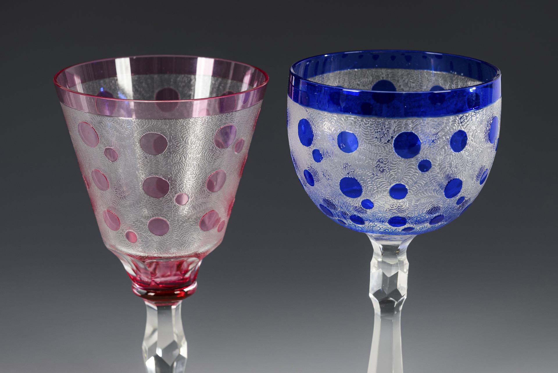 4x bulbous and 1x conical bowl, faceted, central thickened stem with nodus, round foot with star-shaped base. The dome etched with dots and a goblet band. 1 glass below the rim with 4 minimal, probably production-related chips (?) (Ø approx. 1 mm each) in the blue overlay.