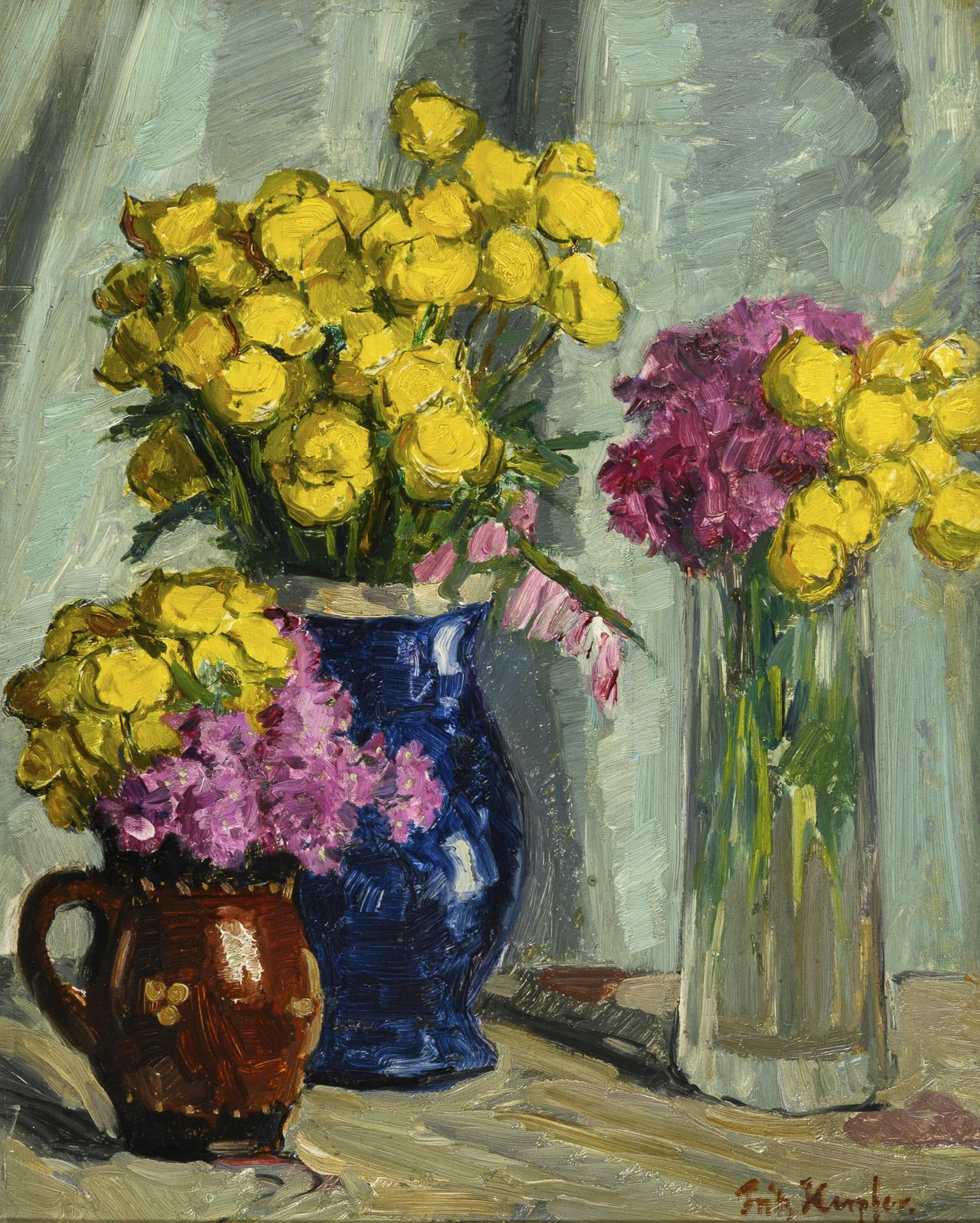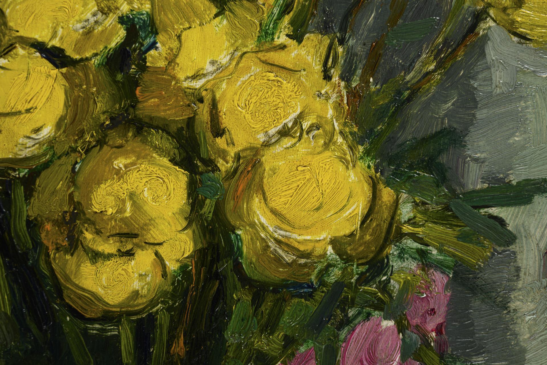 Yellow roses next to purple flowers in three vases in bright light. On the reverse also handwritten information from a former owner on the provenance of the painting since the Second World War.
