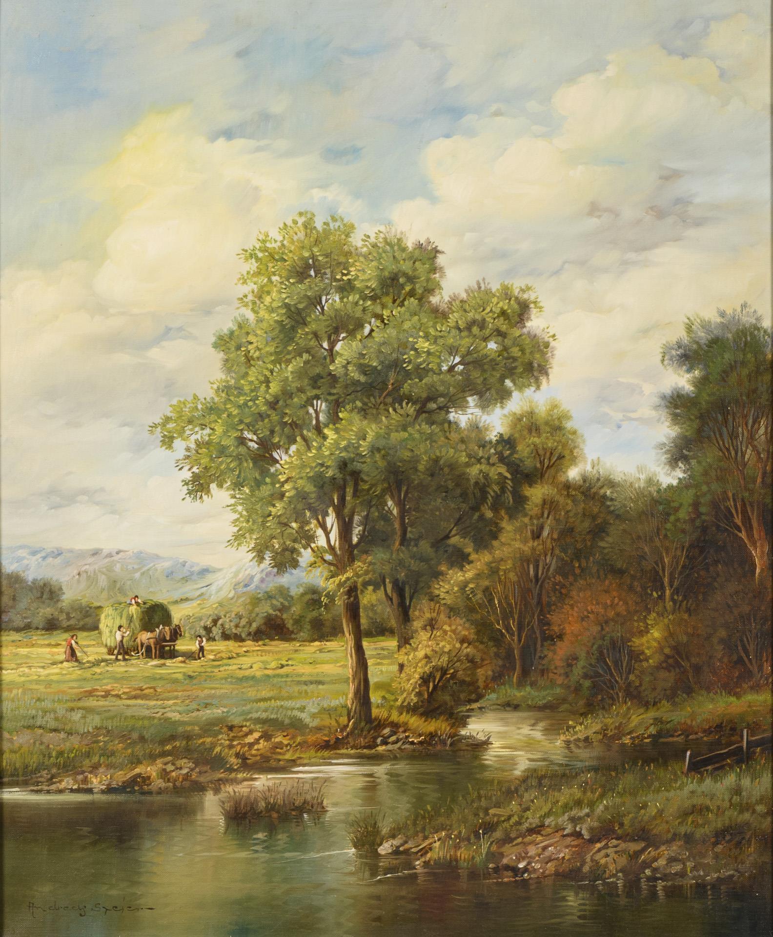 Flat forest and meadow landscape with stream and farmers loading hay.