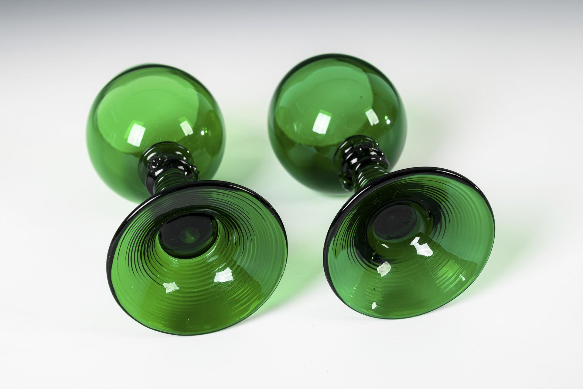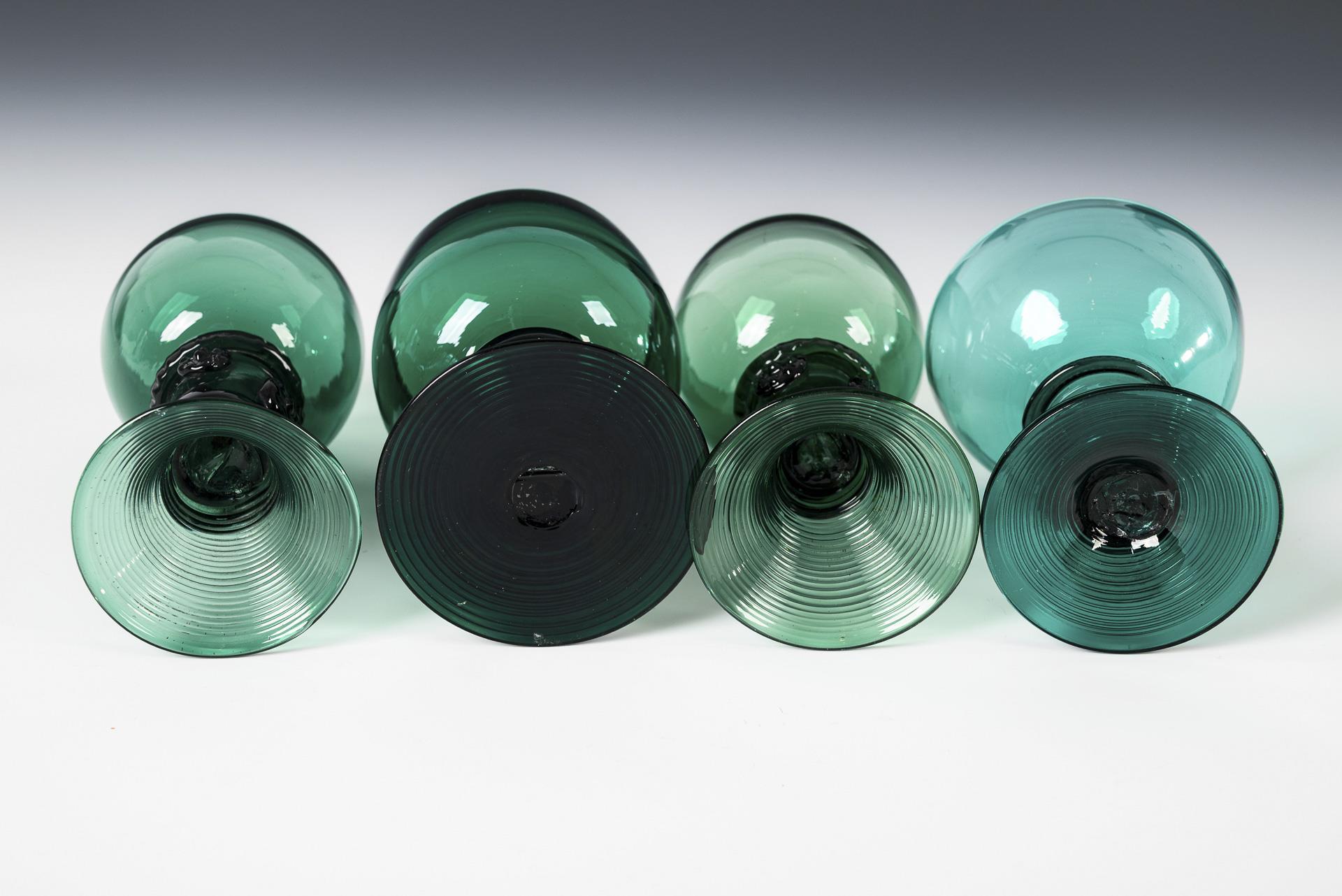 Various dark green glass. H 9.5-15 cm. 950 g.