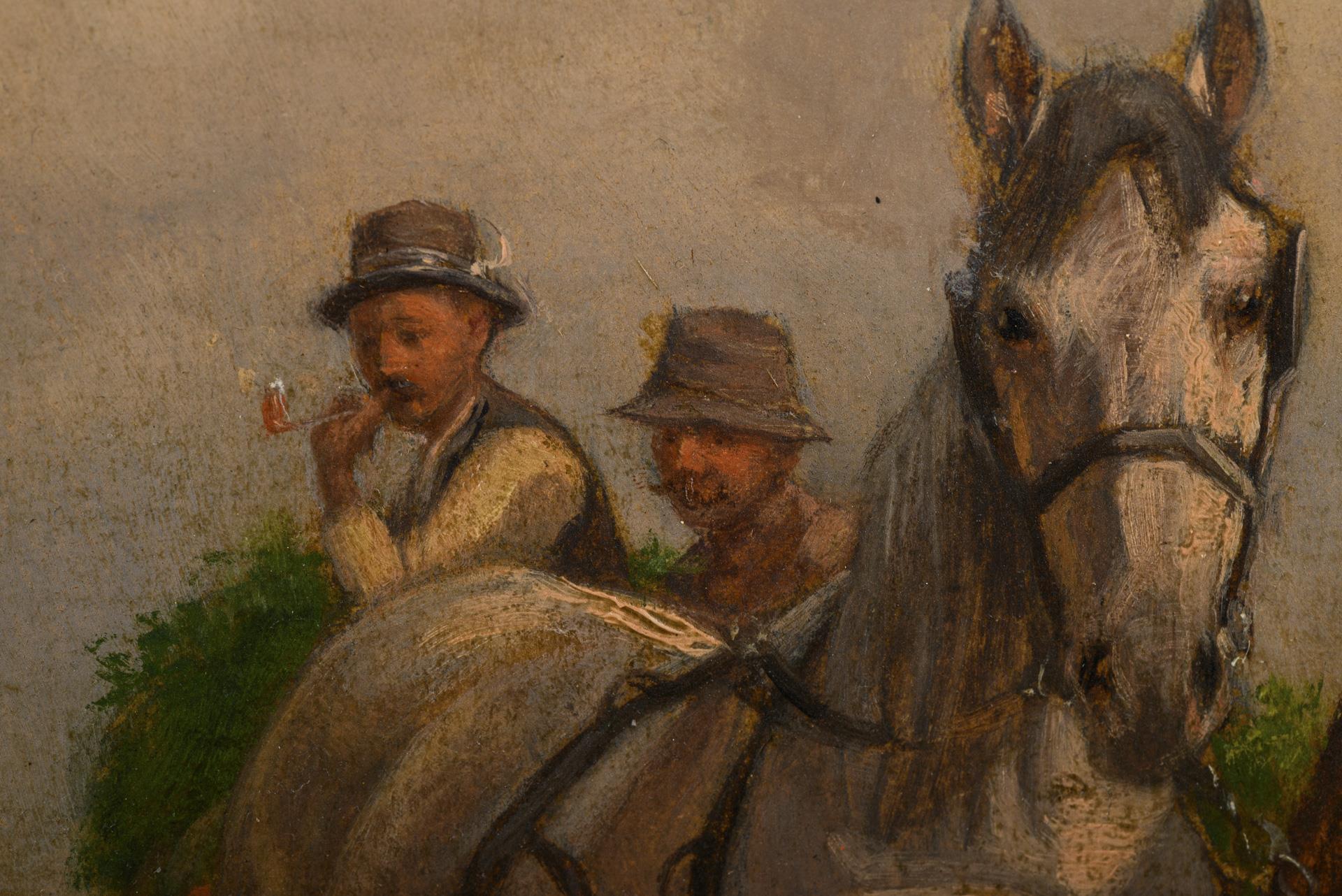Peasants on a horse-drawn cart in conversation with two women at the roadside in the low sun in the evening. Slight traces of age.
