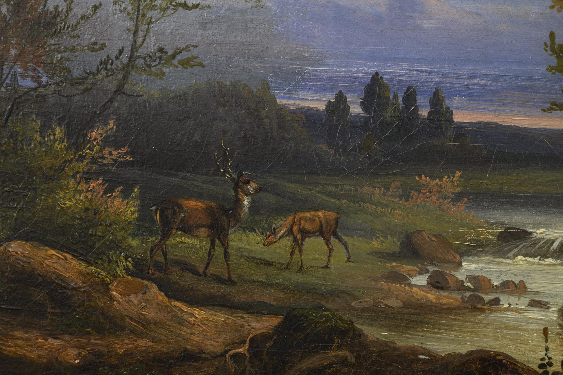 The animals on the shallow riverbank in front of the woodland under a blue sky. Canvas mounted.
