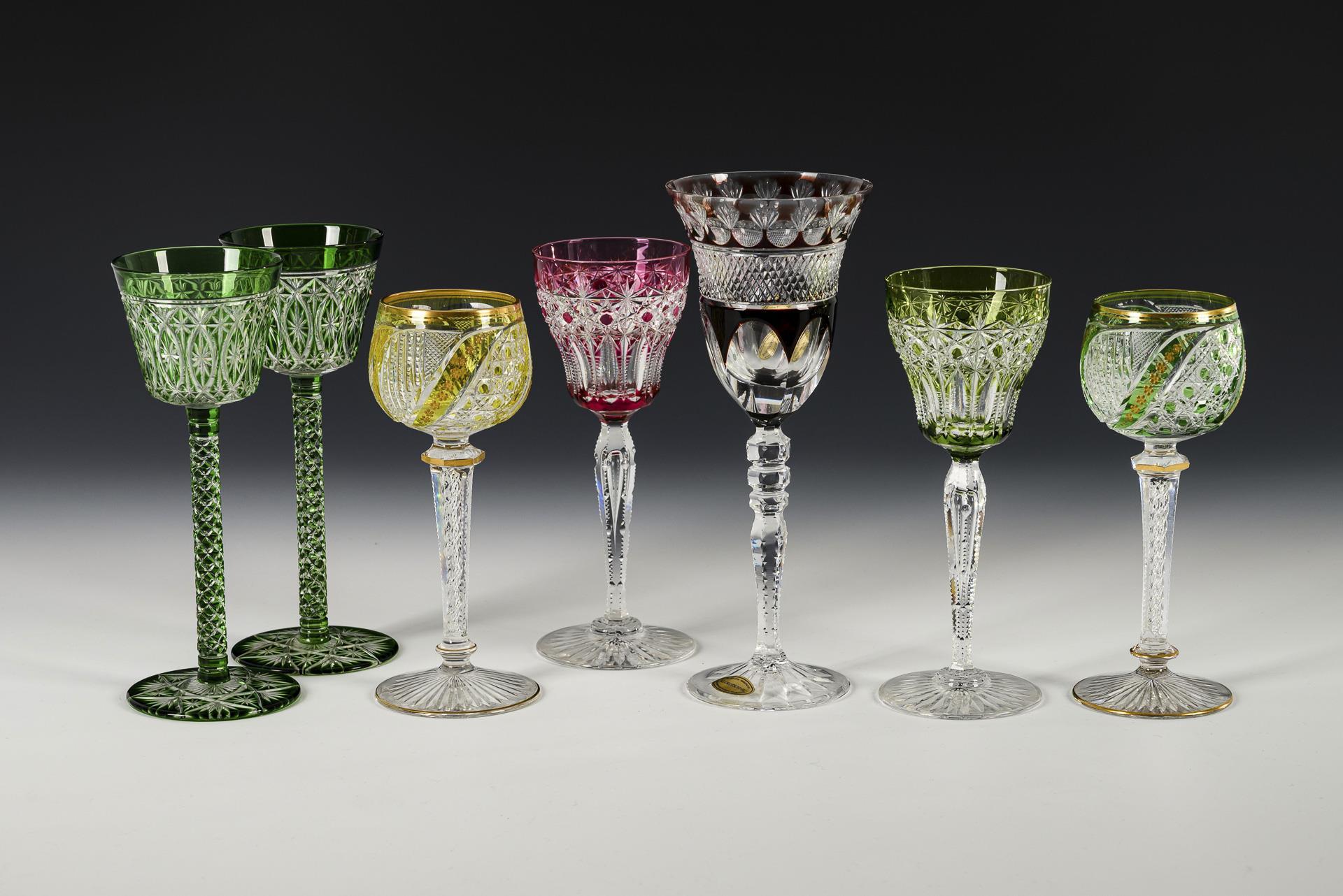 Colorless glass with various colored overlay, 2x with gold decoration. H 18.5-23.5 cm. 2 kg.