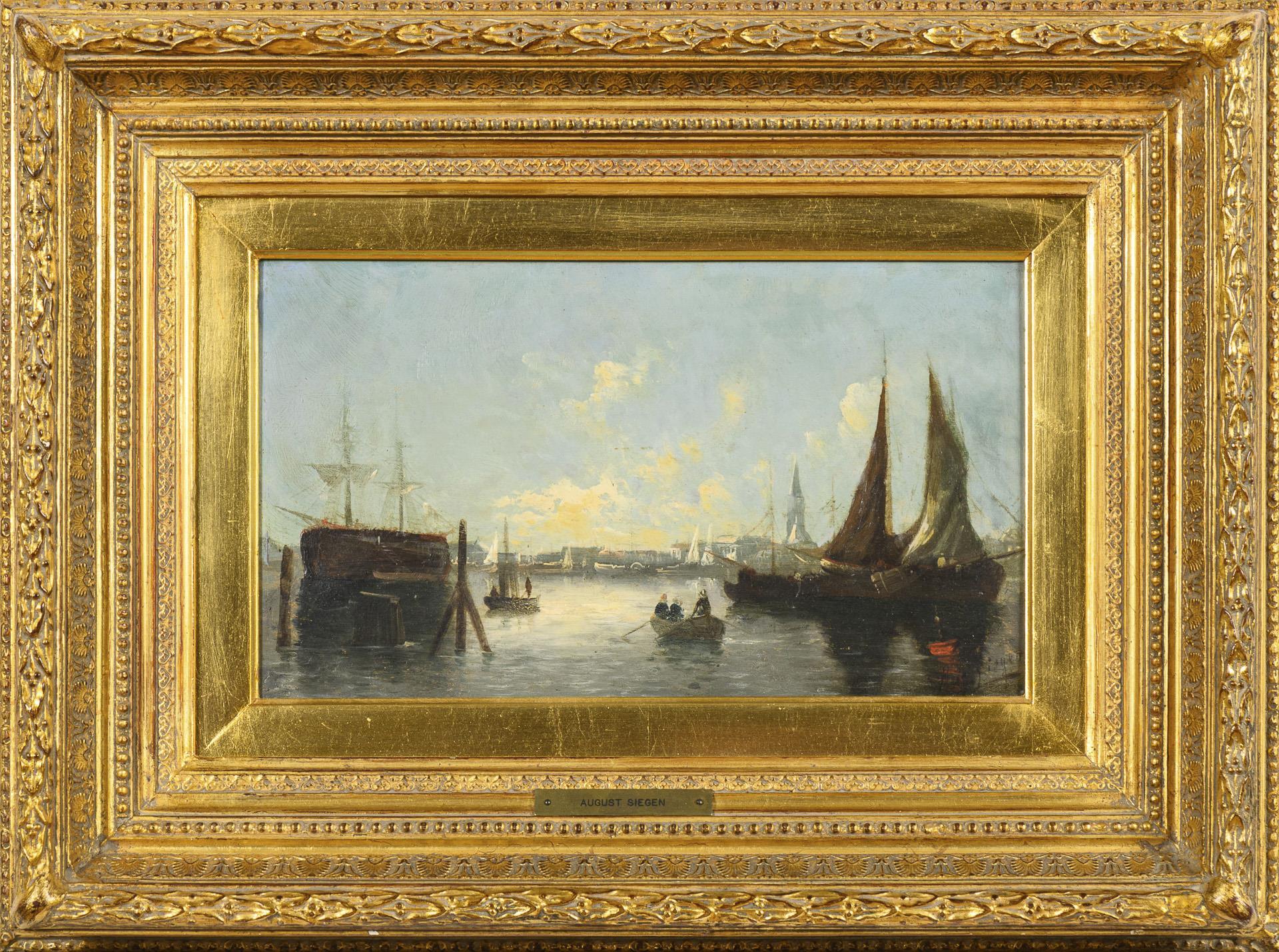 Several sailors in the harbor of the coastal city at sunrise. Retouched in the sky.