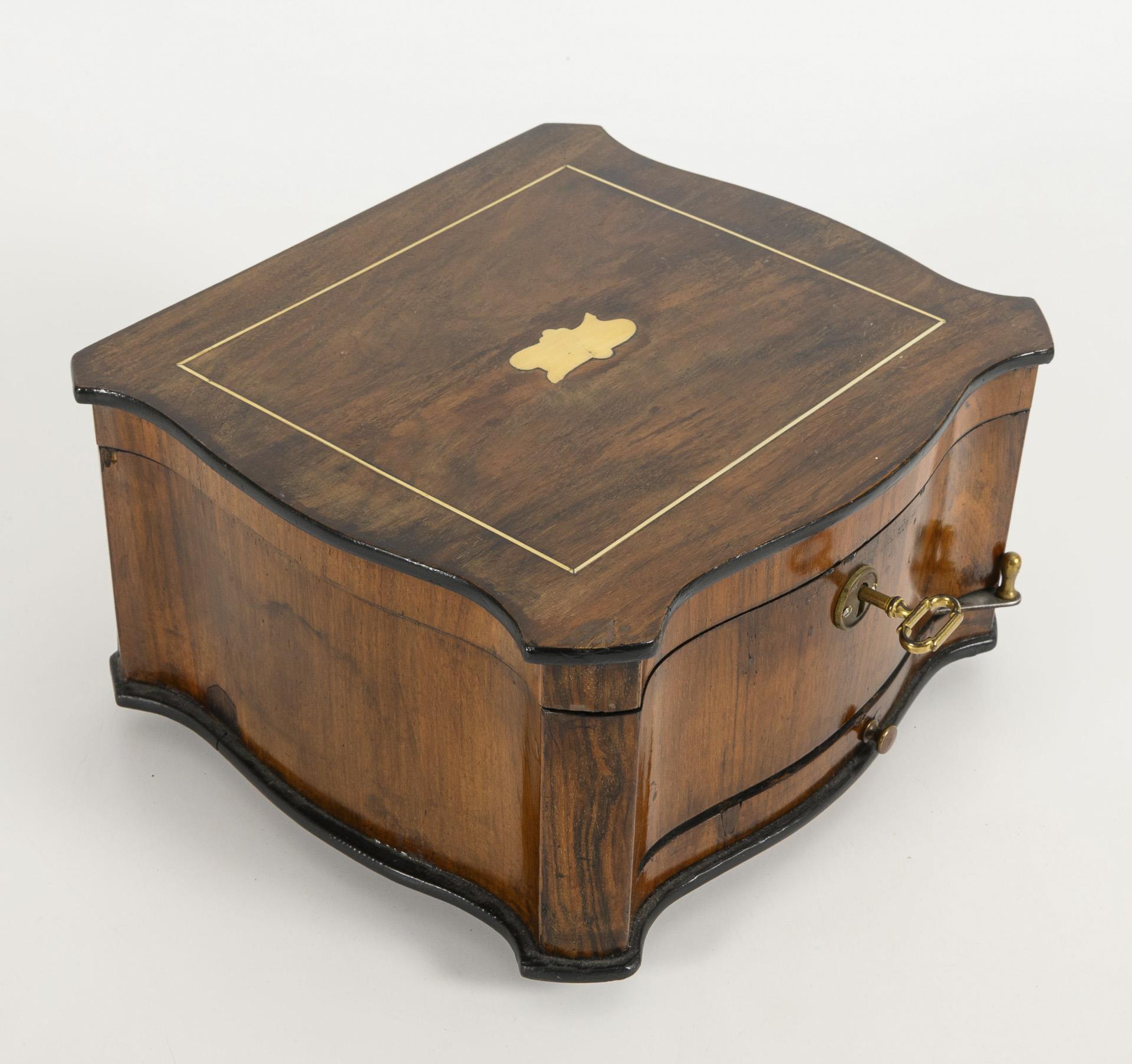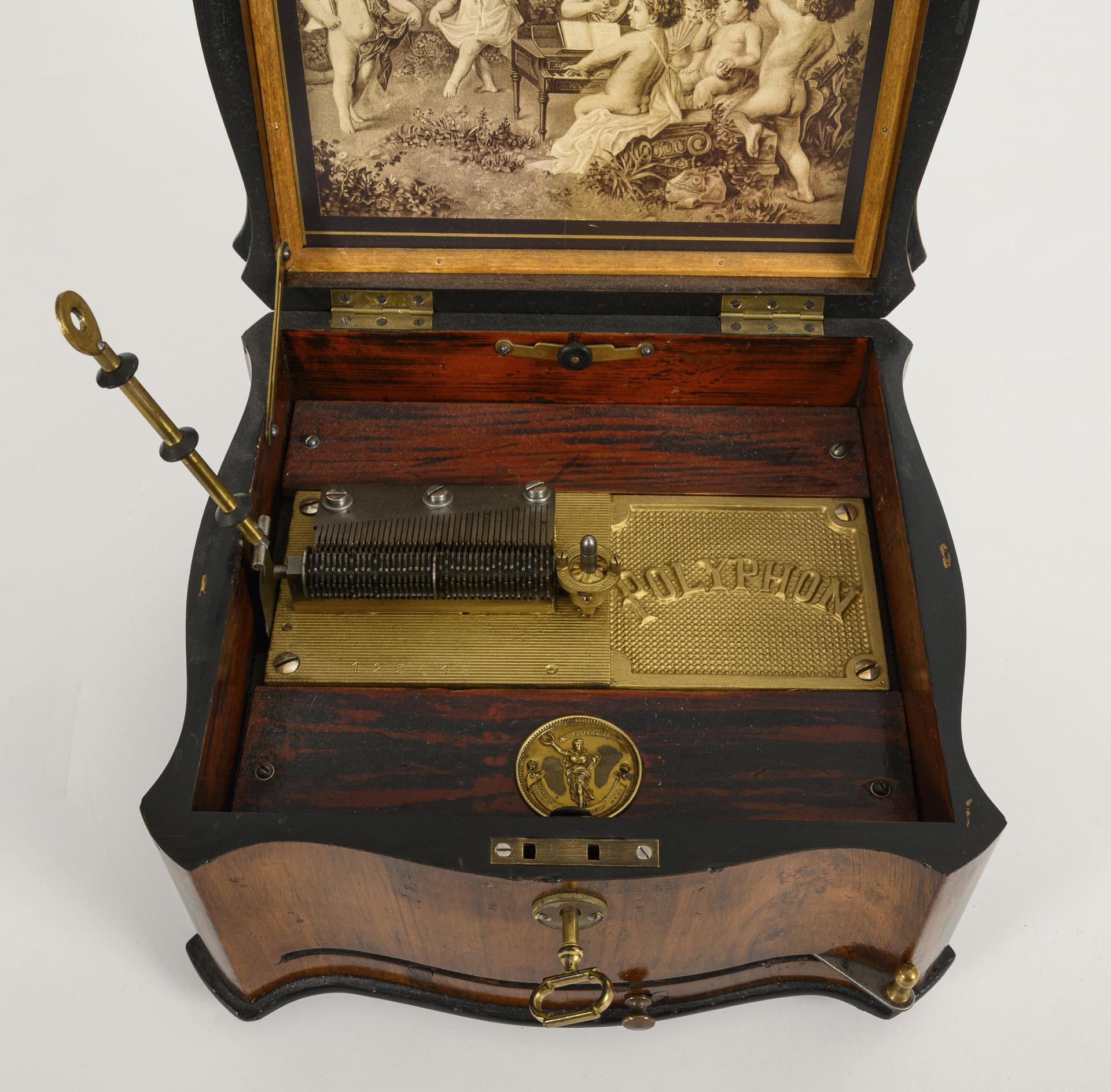 "Music box" with curved sides, ratchet winding mechanism and setting lever in the front, thread inlay and empty cartouche on the hinged lid; glazed print in the lid (putti playing music). Gold-bronzed cast iron base plate with Polyphon lettering, next to it an applied Polyphon plaque. Movement with tongue comb and central drive. Marked polyphonic perforated plates, e.g. Trompeter von Säckingen, Fledermaus, Oh du fröhliche, Waldvögelein etc. Functioning, minor veneer damage and repairs.