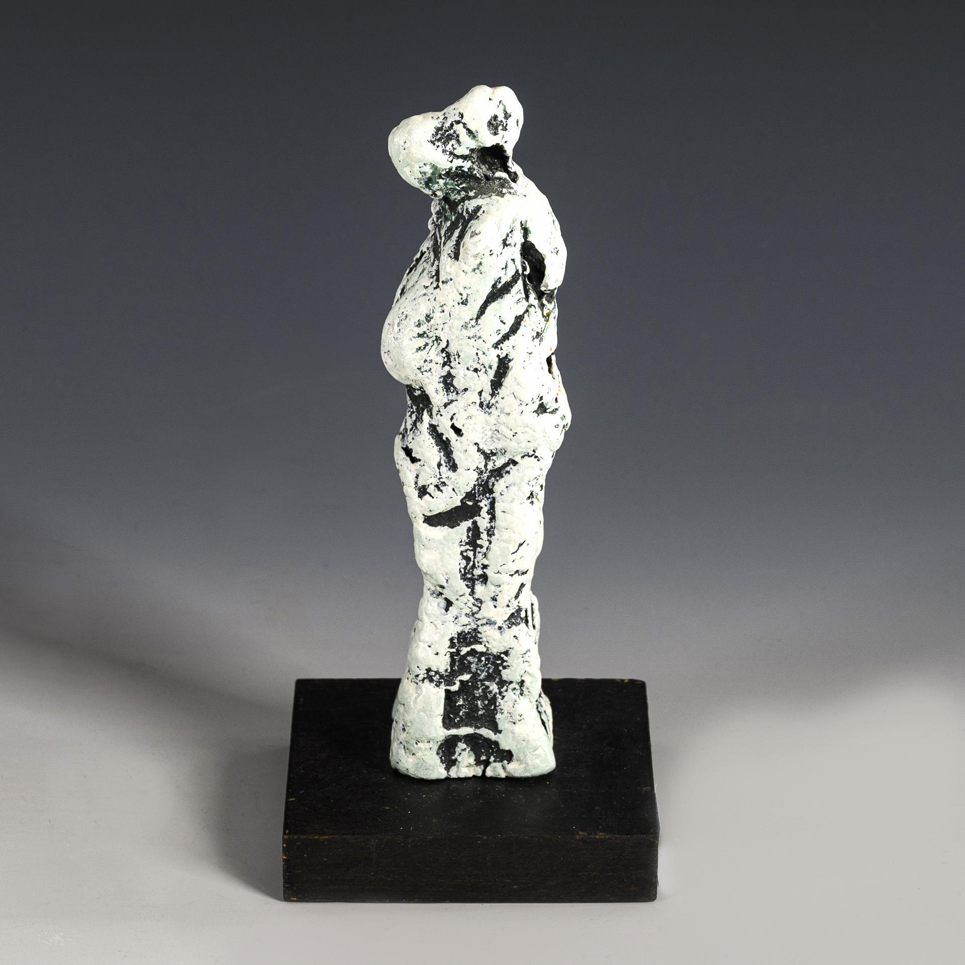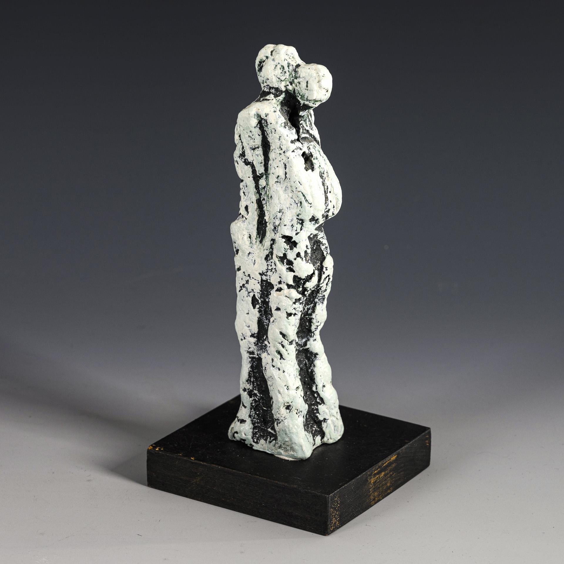 Standing figures fused into a compact volume with a surface broken up in a few places and high-contrast painting. 1 small chip to the shoulder.