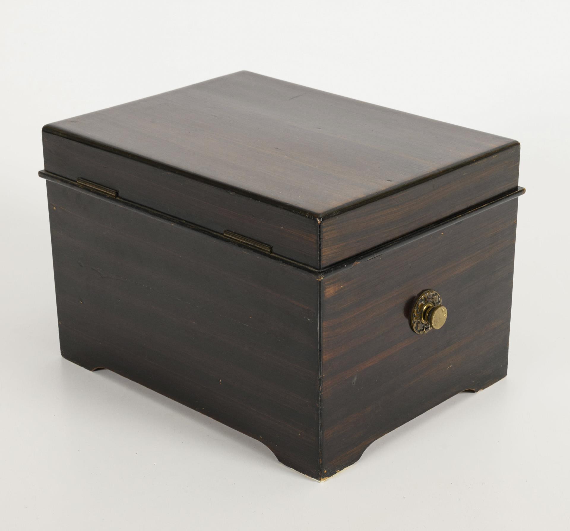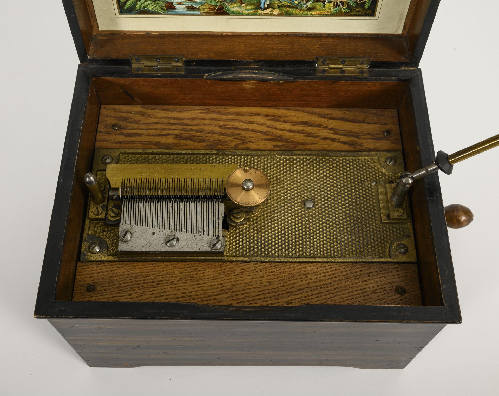 "Music box" with almost cube-shaped case with crank handle and pull lever on the sides. Color lithograph company label with dwarves in a mountain landscape on the hinged lid. Marked musical mechanism with central drive on a fluted cast iron base plate. Marked perforated plates, e.g. Oh du fröhliche, Karneval von Venedig, Stille Nacht, Kaisermarsch, Meine Königin etc. Functioning, minimal signs of age/use.