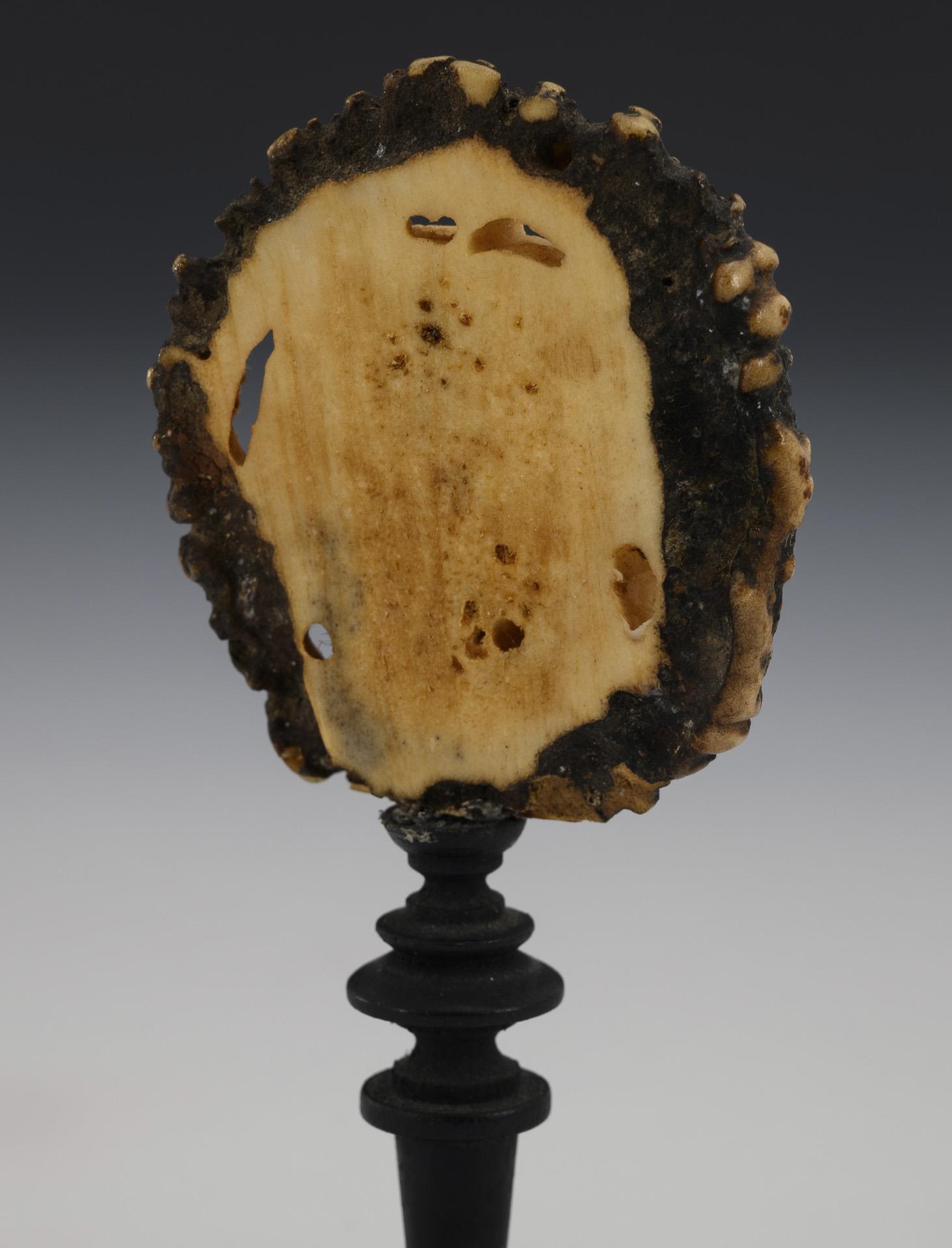 A portrait of a bearded man entwined by a snake, one half of which is carved as a skull; framed by antlers. Finely turned column and round base.