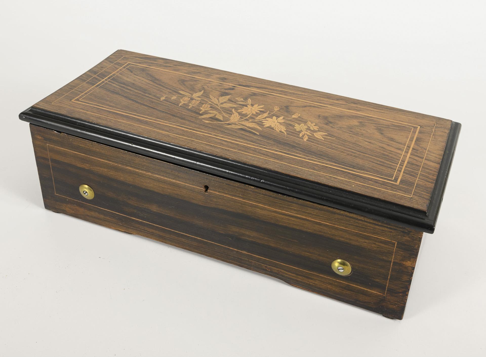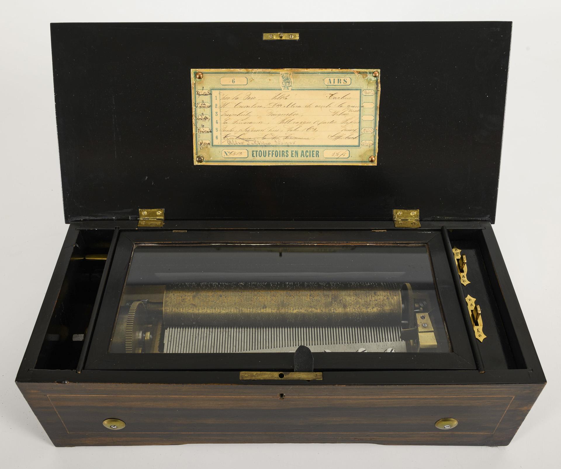 "Roll music box" with branded floral branch on the hinged lid. Inside the lid a label with 6 songs with French titles. Inside, ratchet winding mechanism and 2 adjusting levers; under the glazing, the musical mechanism with stone-mounted wind wheel. Restored, working.