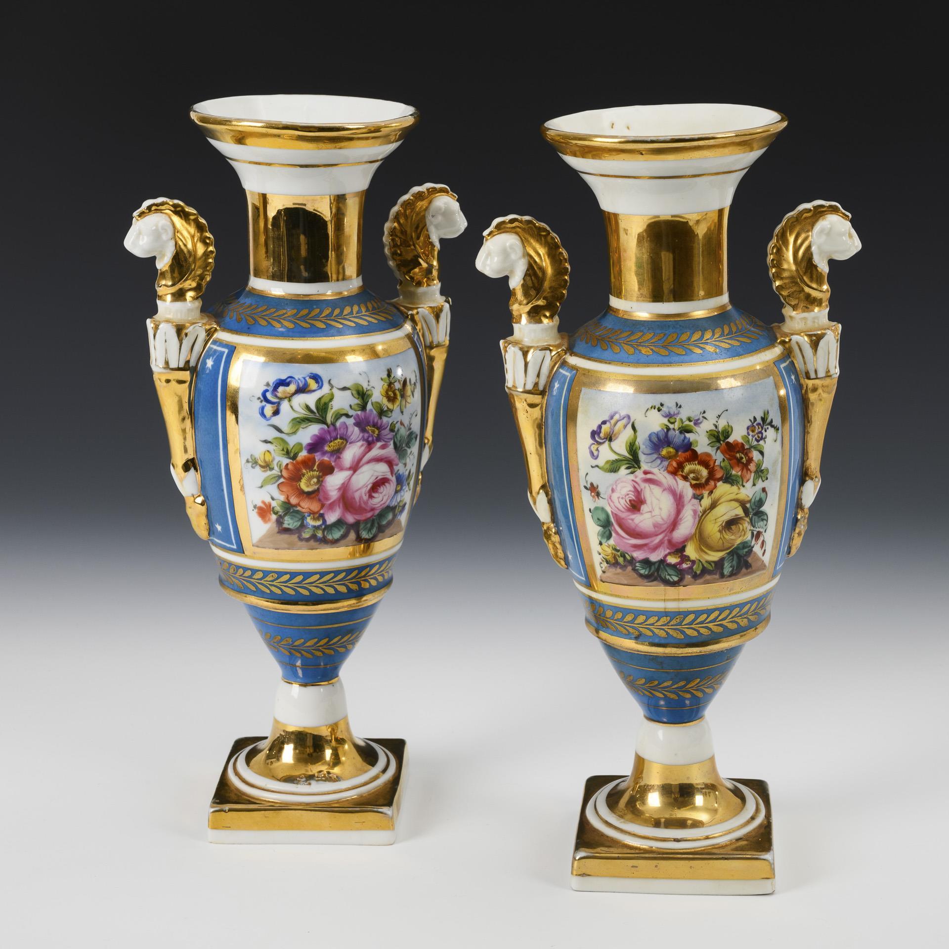 Ovoid body, two lion head handles, crater neck, round foot, square plinth. Turquoise blue ground, on the front a gold-framed rectangular cartouche with a bouquet of flowers, on the reverse a pair of gold-etched cornucopias. Minimal chip to 1 body base, 1x body base restored.