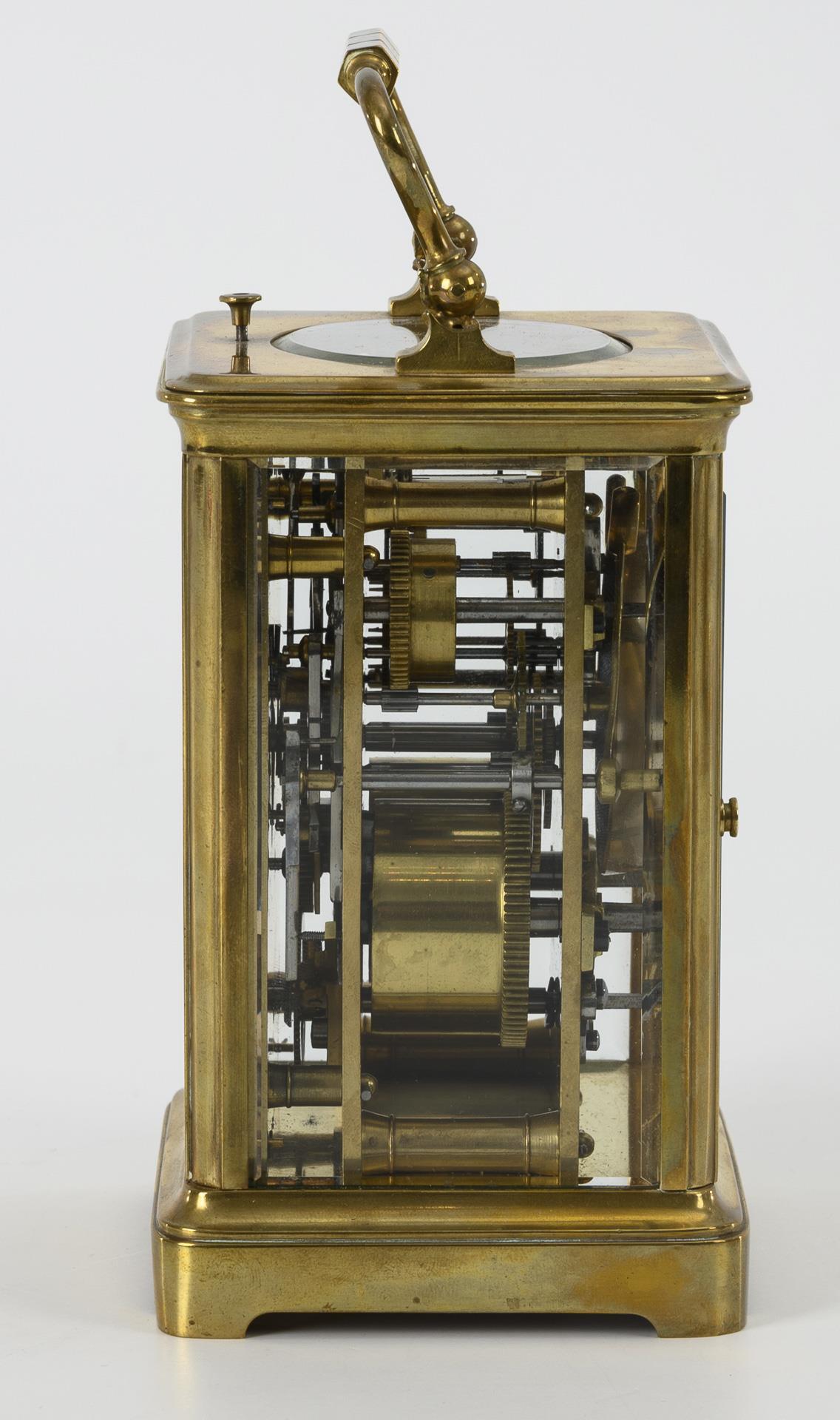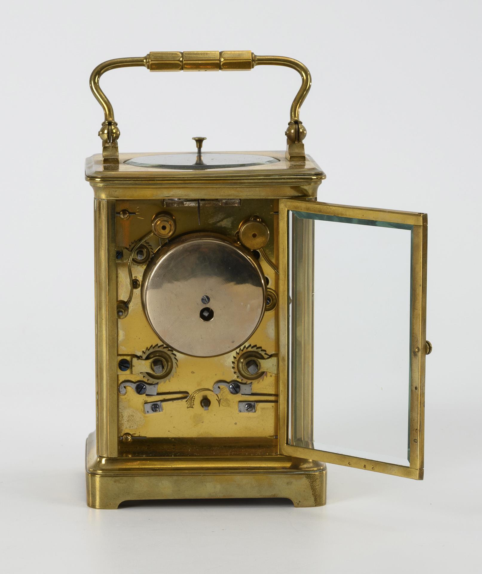 Unmarket brass plate movement with overhead balance, anchor escapement, hour and half-hour strike on bell, alarm strike on bell, separate pusher for hour repeater, keywind. Functional in short time test. White enamel chapter ring with Roman numerals, minute ring, spade hands and sub-dial for alarm.