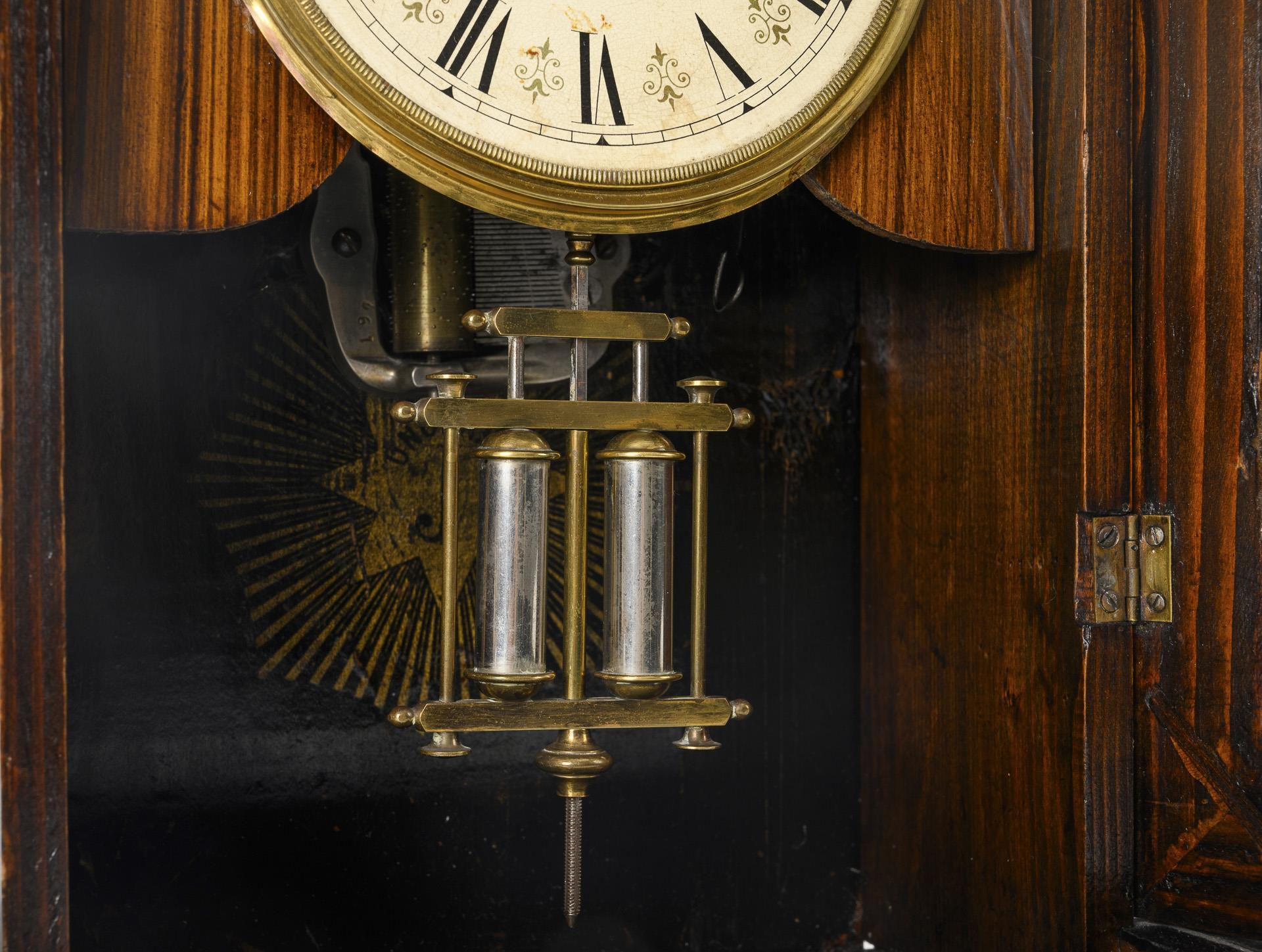 Architectural case with curved pediment, front glazing and widely projecting base. Stucco-gilt, classicist decorative strips and appliqué decoration. Slight signs of age and wear.