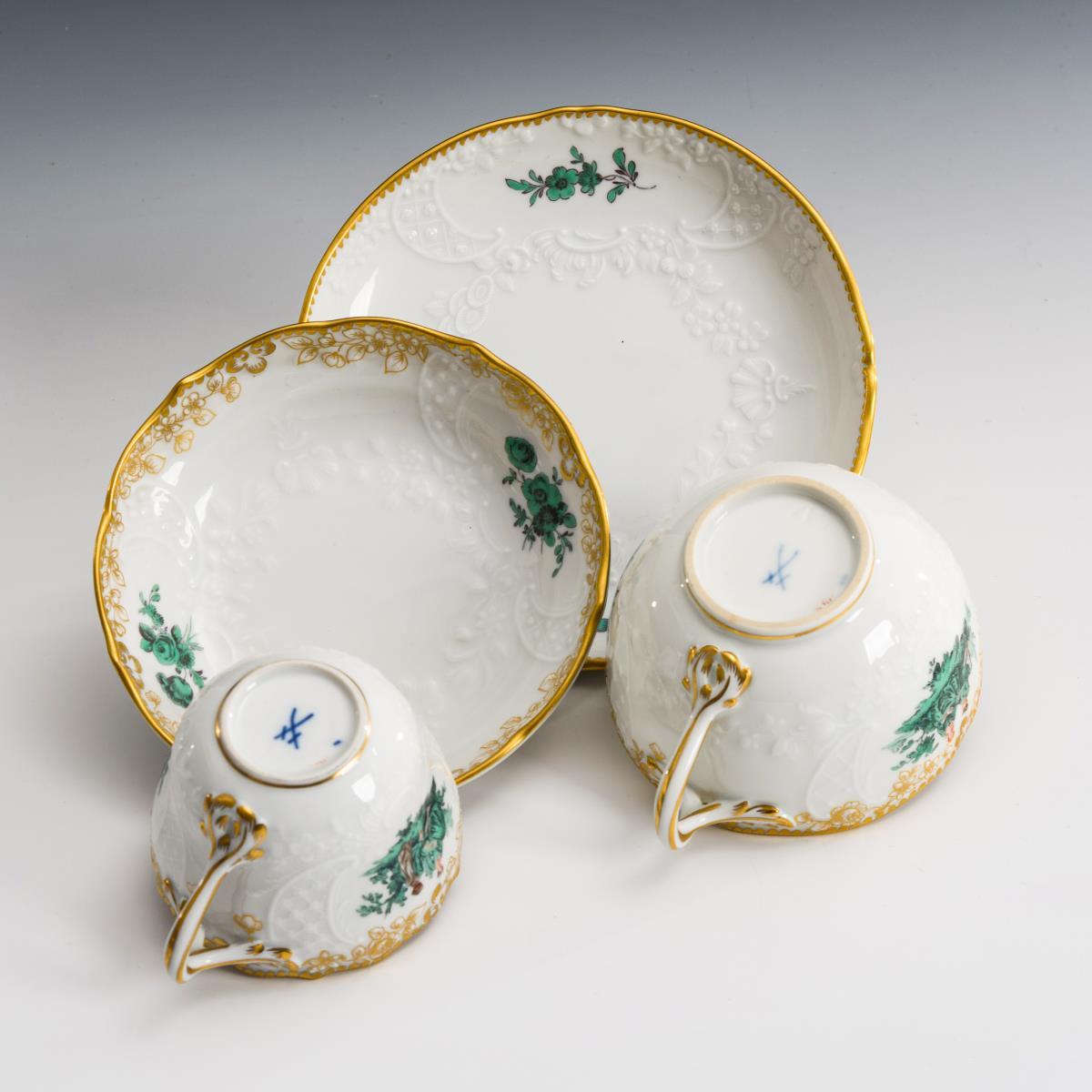 2 Tassen mit kupfergrüner Watteaumalerei.