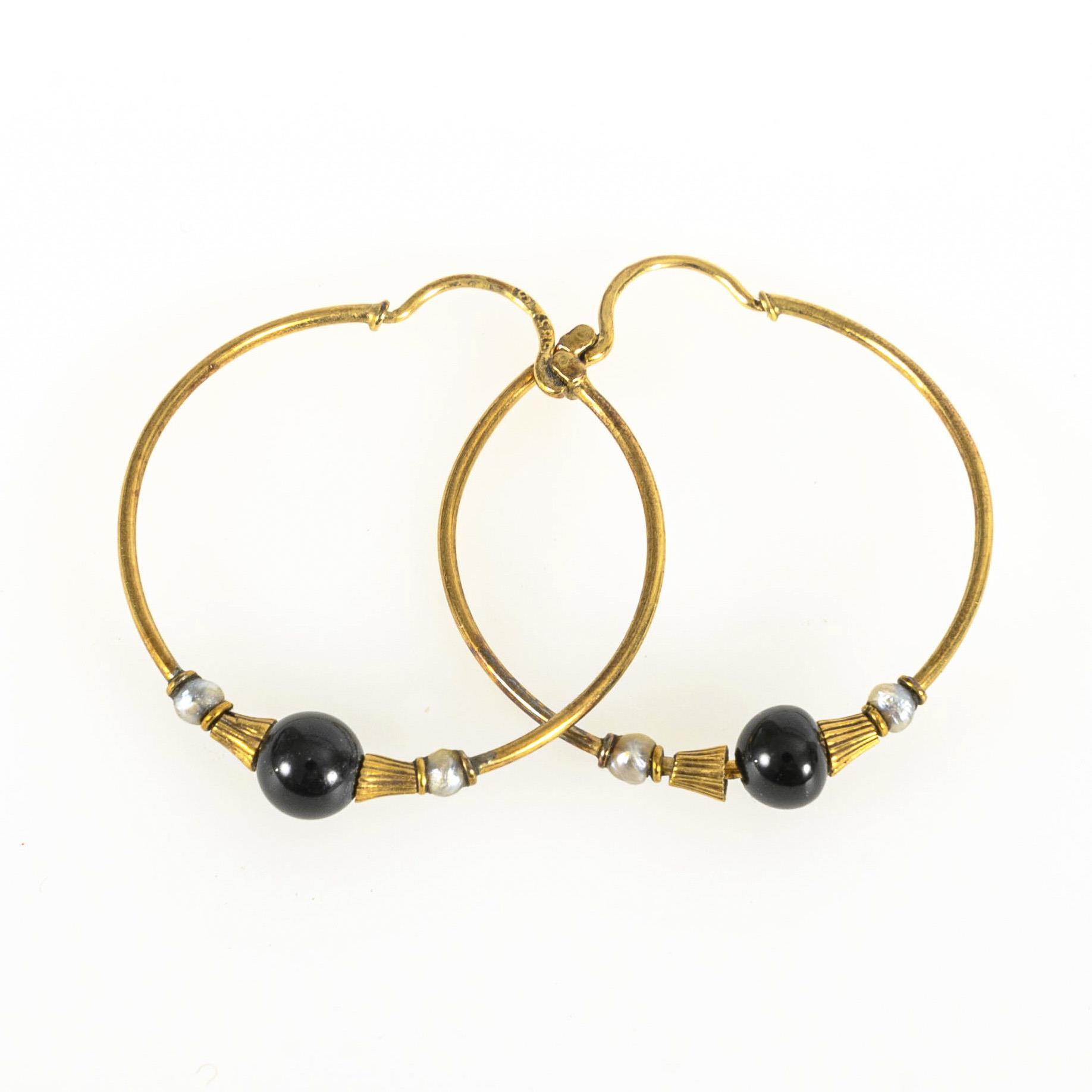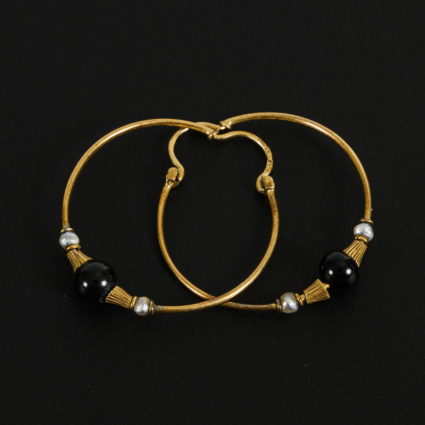A pair of delicate hoop earrings, each decorated with two gray pearls, two small gold pots in relief and a larger dark gemstone sphere.