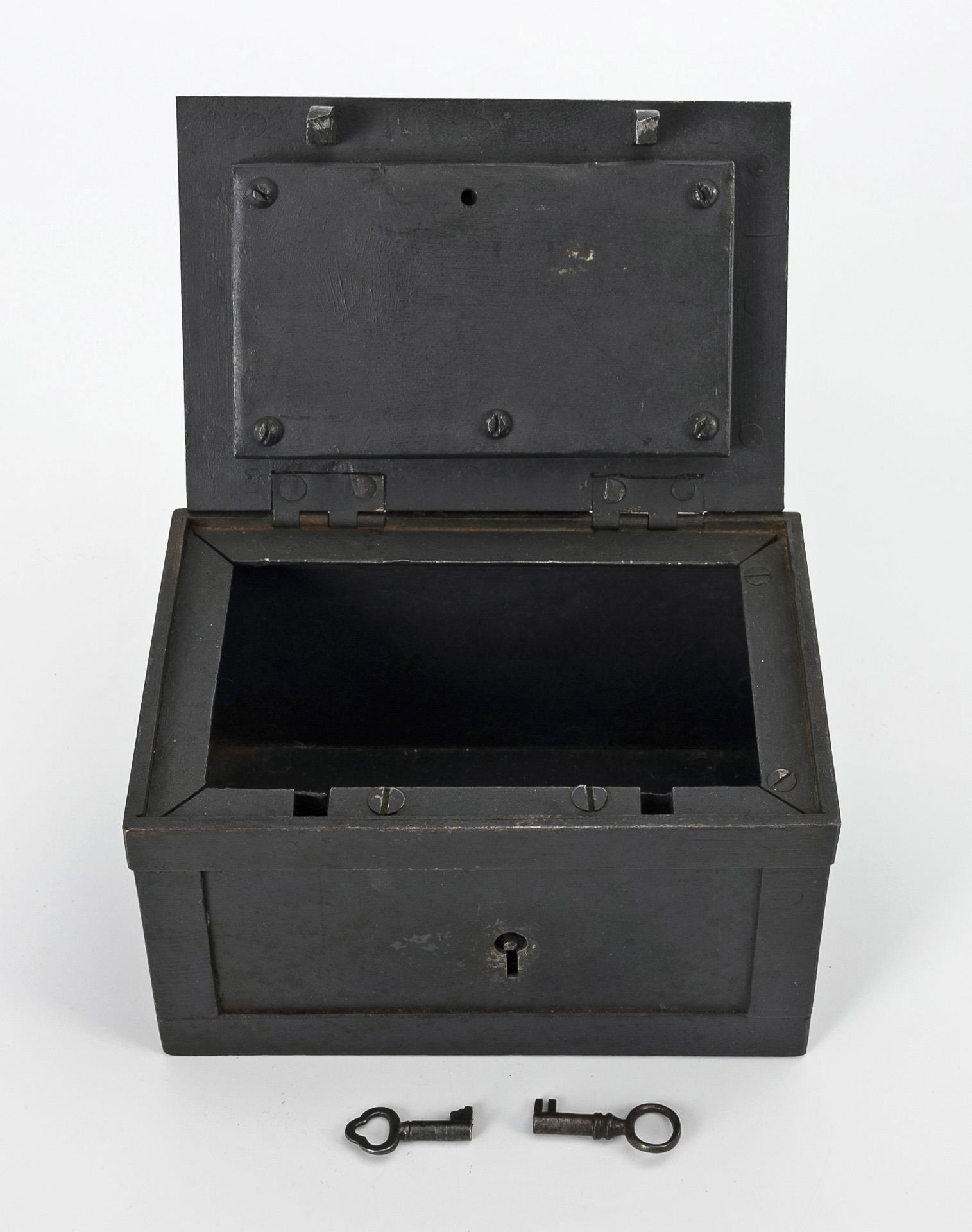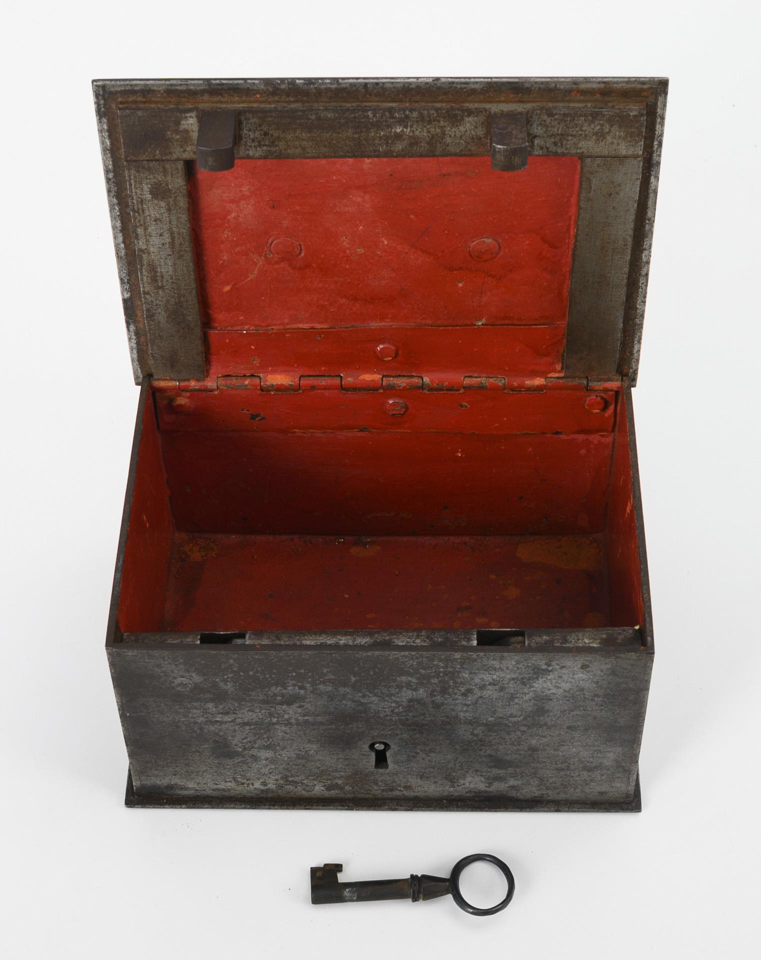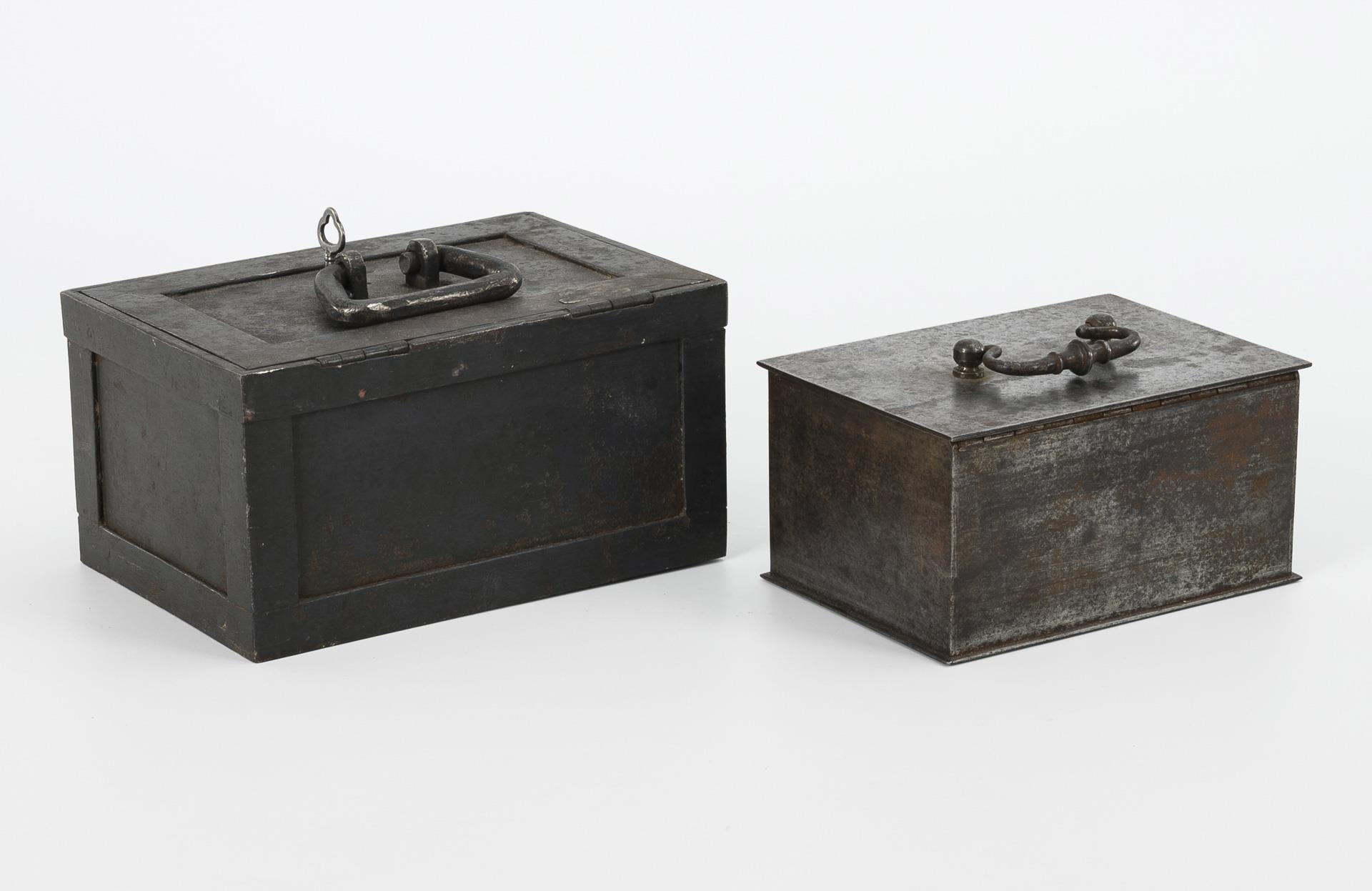 Plain square caskets with movable carrying handles on the hinged lids. The larger casket has reinforced edge bands and 2 keys (in the front and in the lid). The smaller one is painted red on the inside. Minimal signs of age/use.