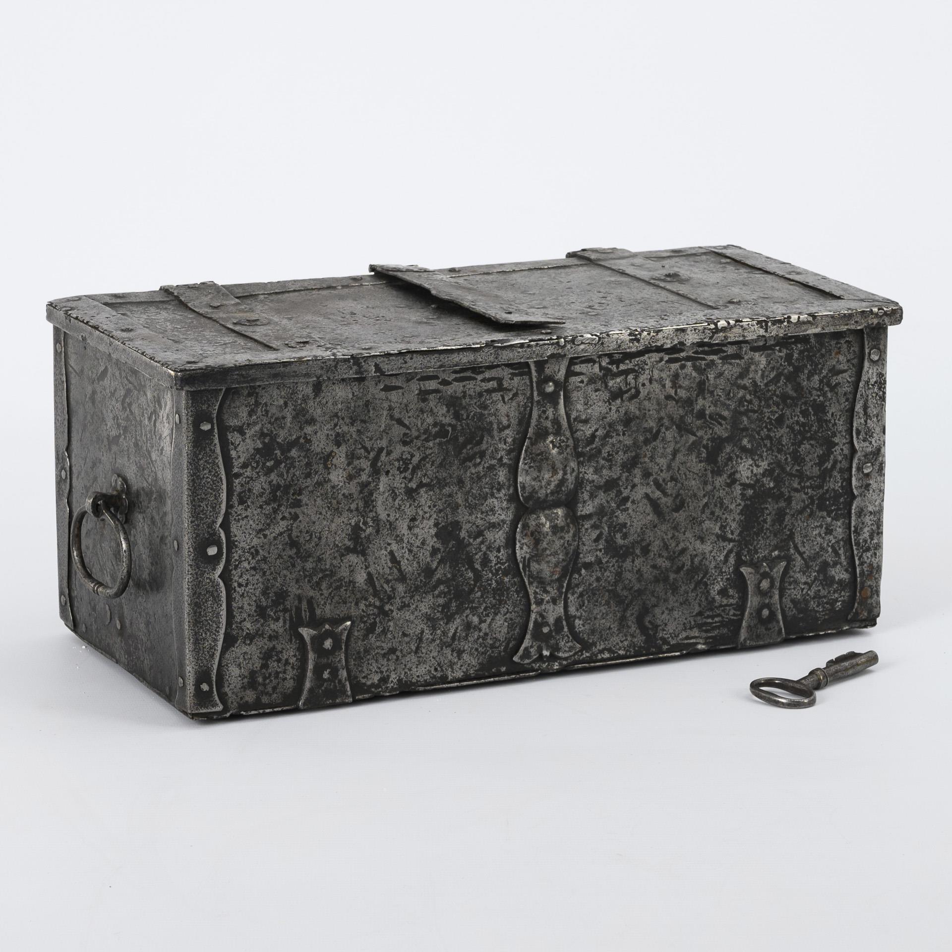 Square iron casket with movable handles on the sides and partly curved band reinforcements. The keyhole cover on the hinged lid opens by sliding a rivet with washer. Inside the lock with 4 movable latches and 2 fixed tumblers as well as a small hatch with pull lever lock. Defective hinge on the keyhole cover, traces of welding on the hinges, missing decorative washers on the lock, signs of age/use.