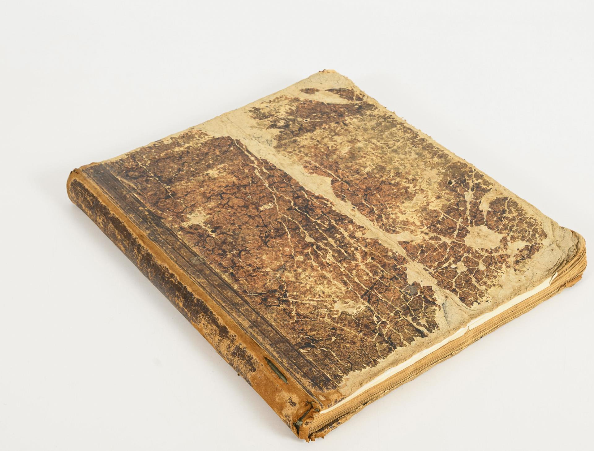 Complete with 80 maps, border-colored steel engravings, in half leather binding. Handwritten table of contents. Strong signs of age and wear, title page torn, block with large foxing stain which becomes larger towards the end of the book, occasional smudged ink stains, edges bumped.