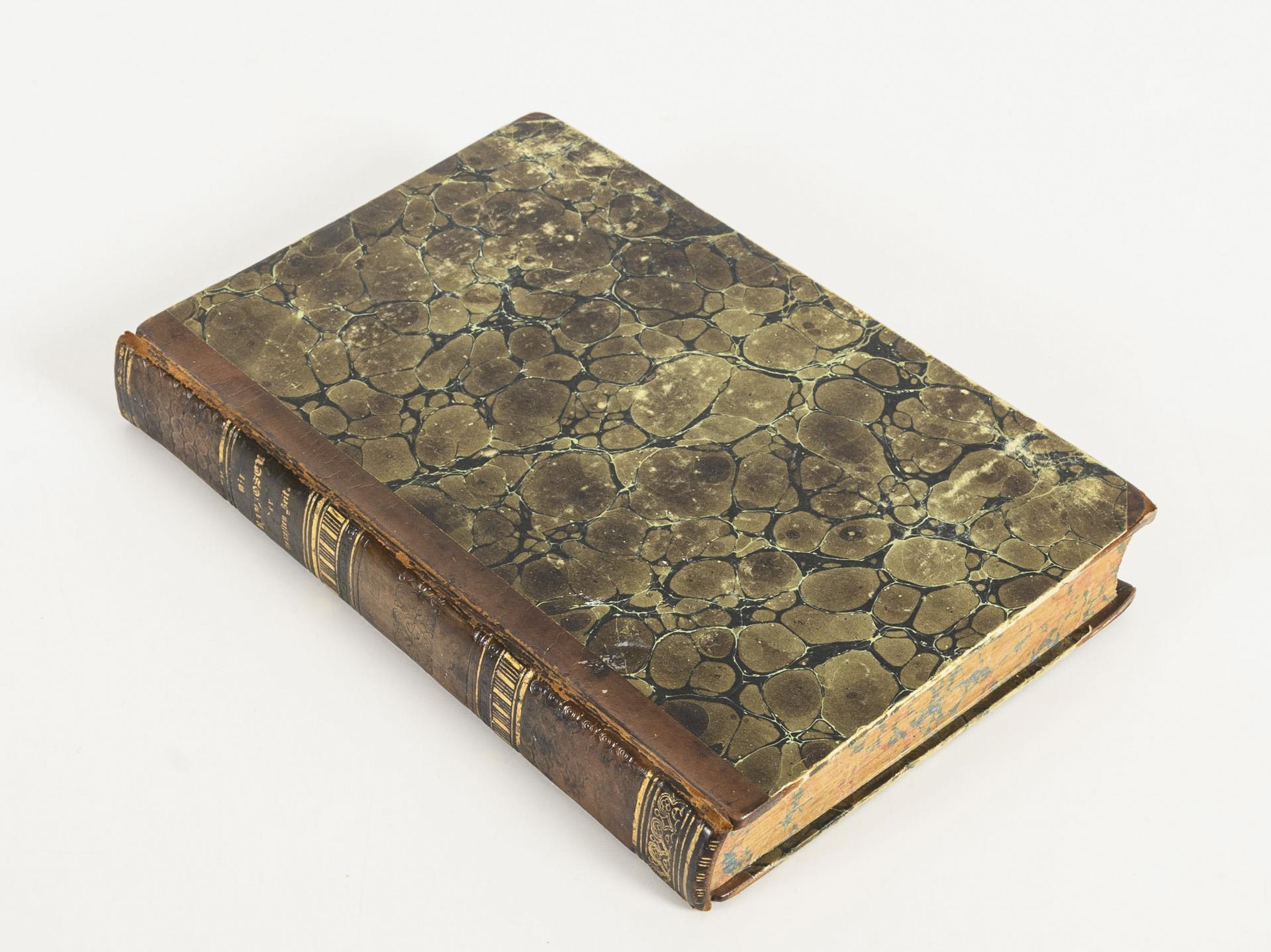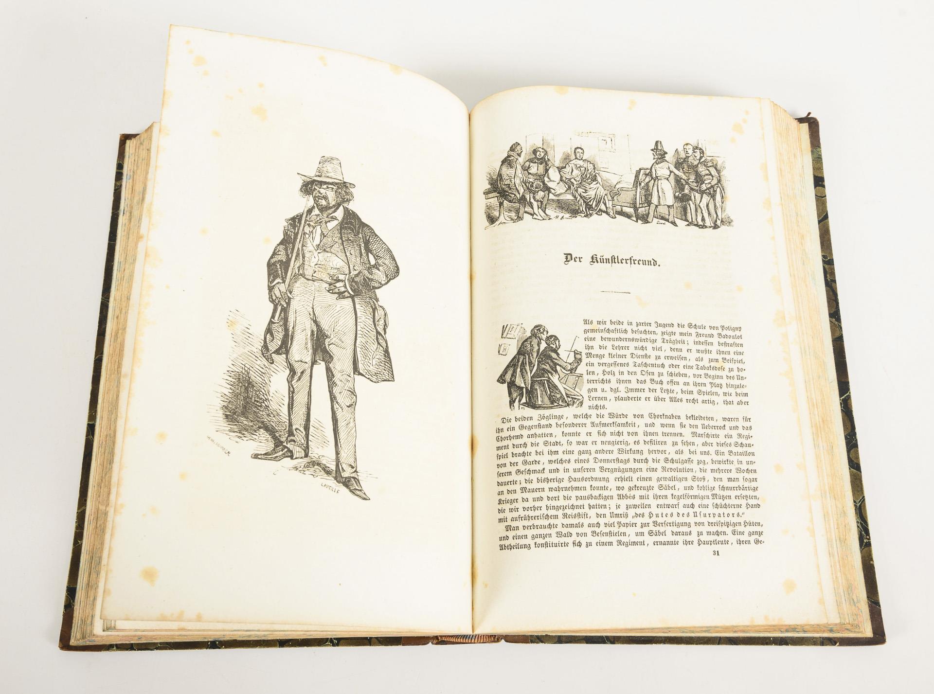 384 pages with many full-page woodcuts integrated into the text. In half leather binding. Satirical texts by Balzac, Roux, Janin, Couailhac, Roux and others. In German. Block somewhat foxed.