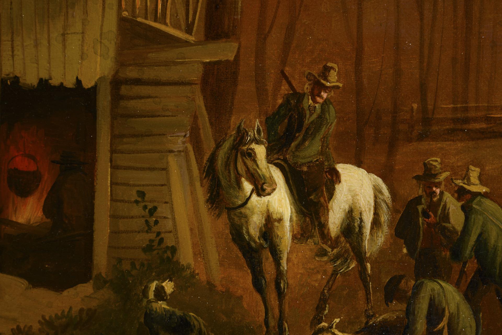 The men after a successful hunt at the hut by the river. A defect.