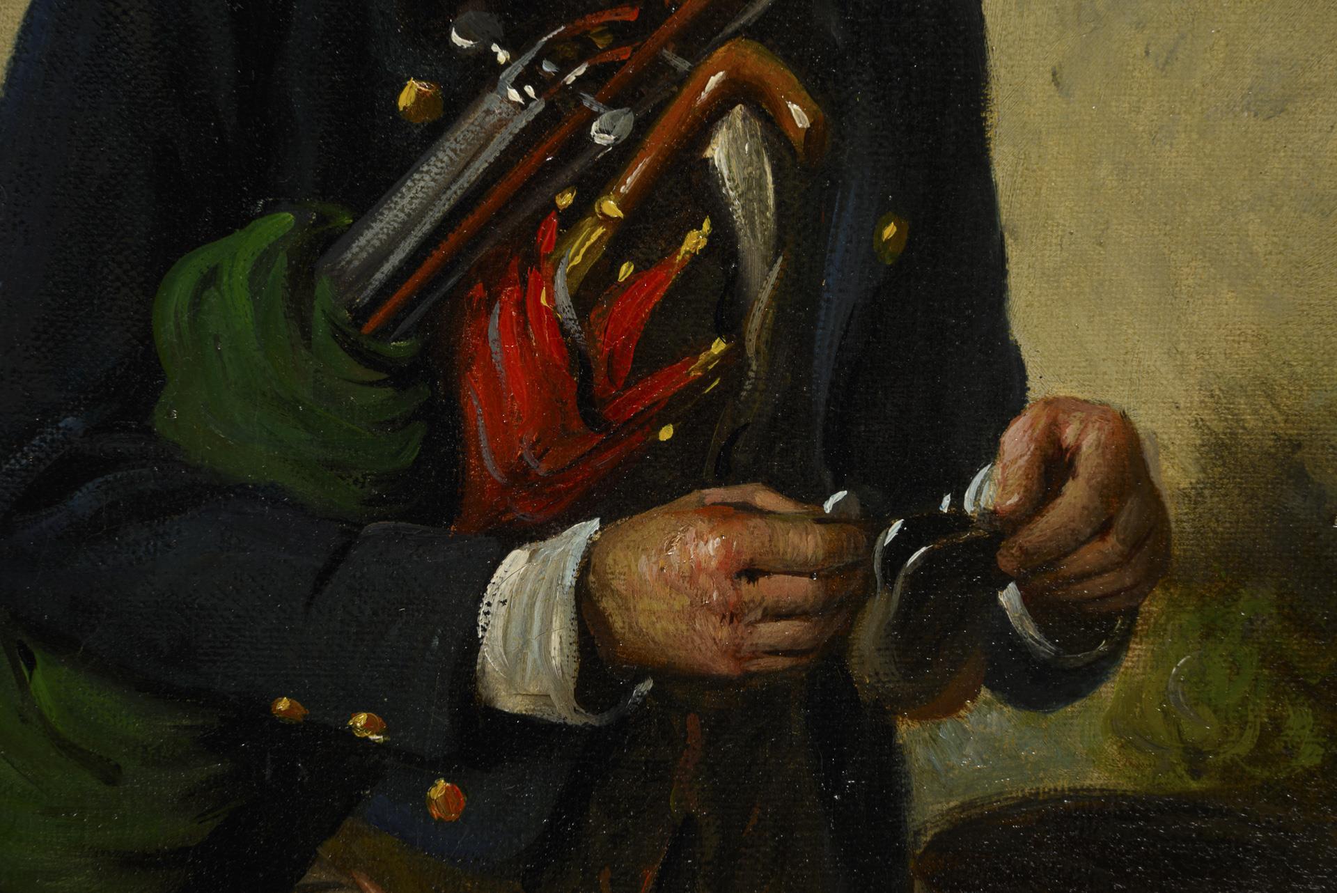 Genre scene with musician and craftsman in the kitchen at a meal. One very small restored area with backing.