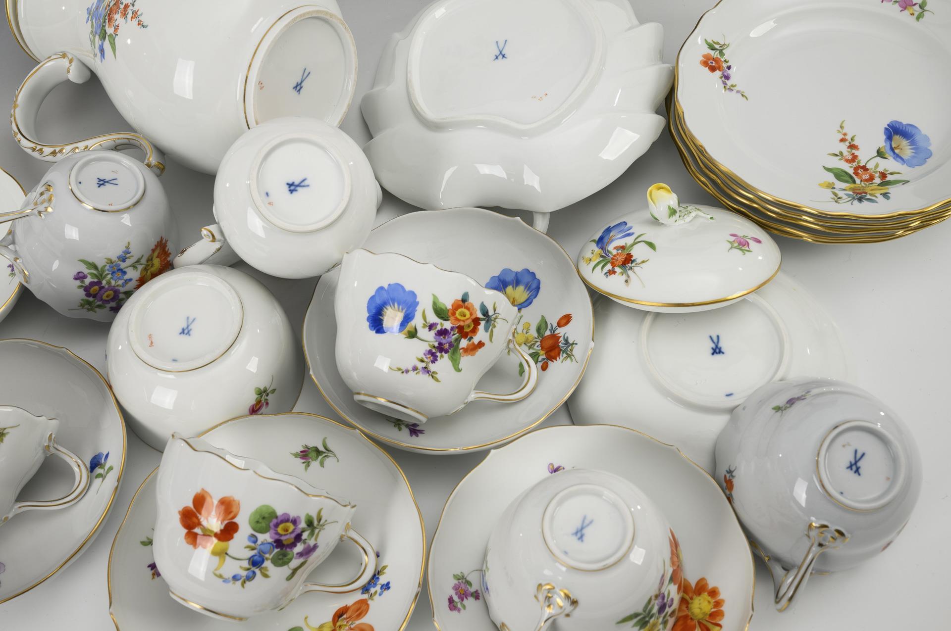 23 parts. "New cut-out" shape. Coffee pot (H 24.5 cm), milk jug (H 12.5 cm), sugar bowl (H 10.5 cm), 6 coffee cups, 6 saucers, 6 breakfast plates, cake bowl (⌀ 27.5 cm) and leaf bowl with relief decoration "Marseille". Partial minimal wear to the gold, knobs to the lids of the coffee pot and sugar bowl with chips, repair to the coffee pot lid, 1 saucer with chip to the rim.