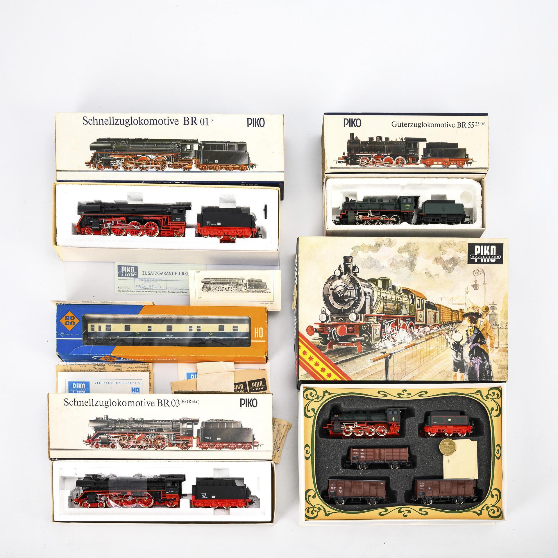 H0 gauge. Piko-Odtimer "Länderbahn 1913", model of the freight locomotive G8 of the K.P.E.V. 6 x 33.5 x 22.5 cm. / BR 01 express locomotive and BR 03 0-2 express locomotive (Reko). 5.5 x 36 x 10.5 cm. / BR 55 25-56 freight locomotive. 5.5 x 26 x 9 cm. / ROCO International freight wagon 4262. used, 1 axle loose. 4 x 34 x 8 cm. Function not tested.