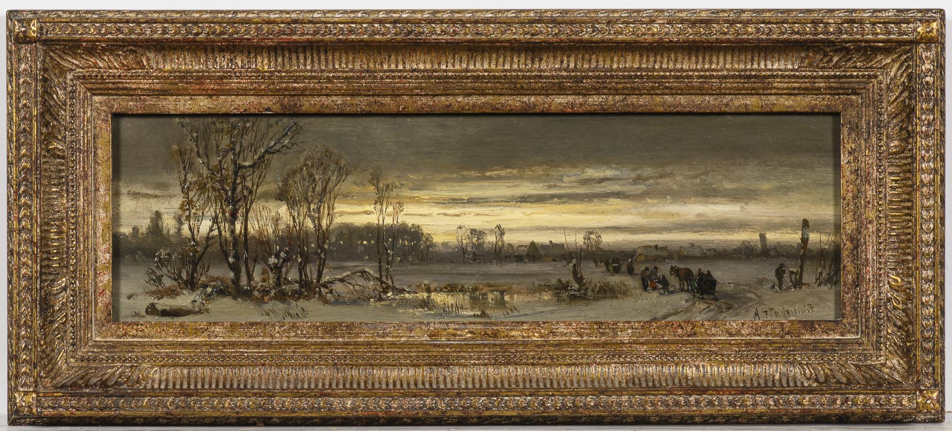 Wide, flat landscape with staffage figures on a snow-covered road towards the village in the evening.